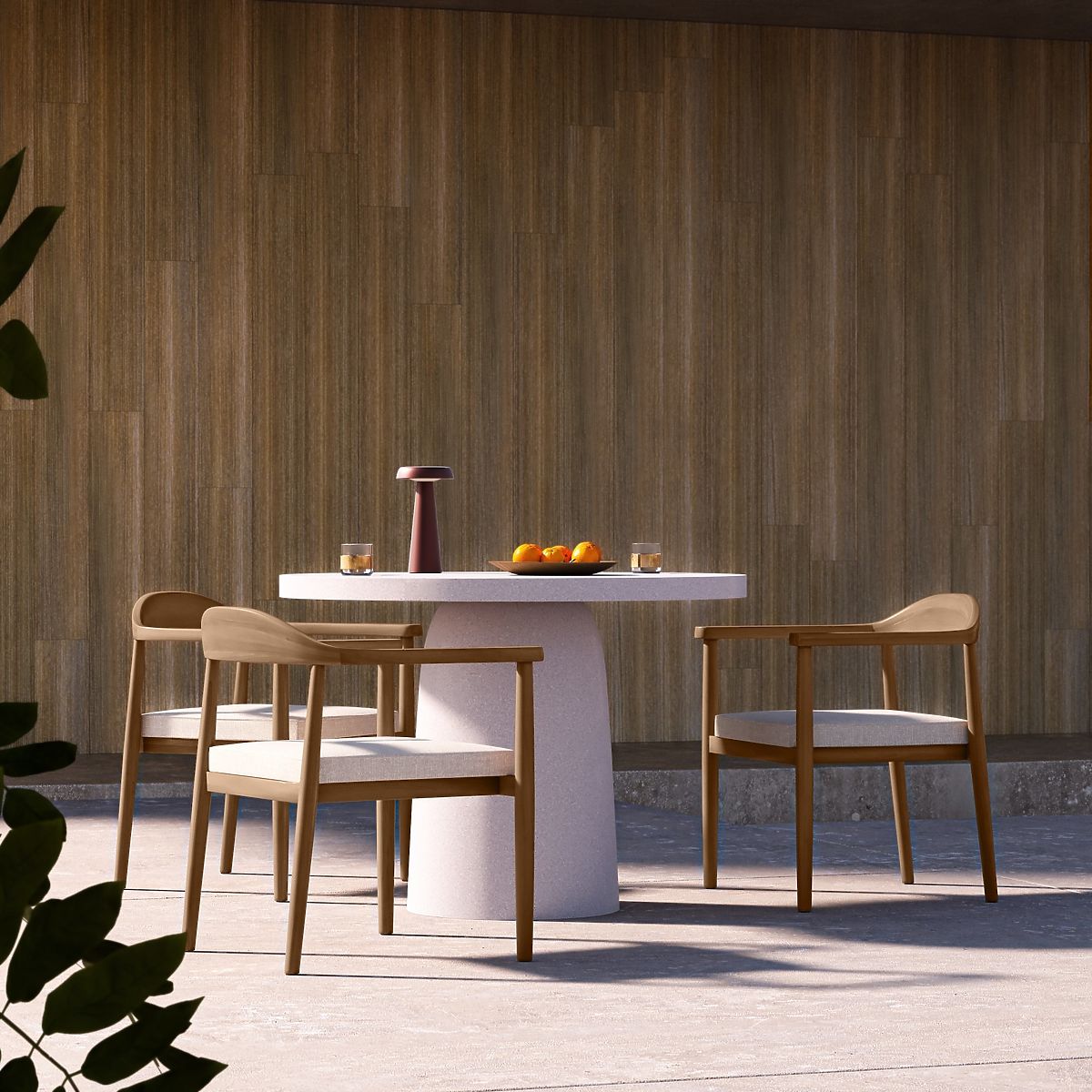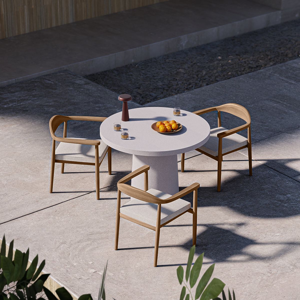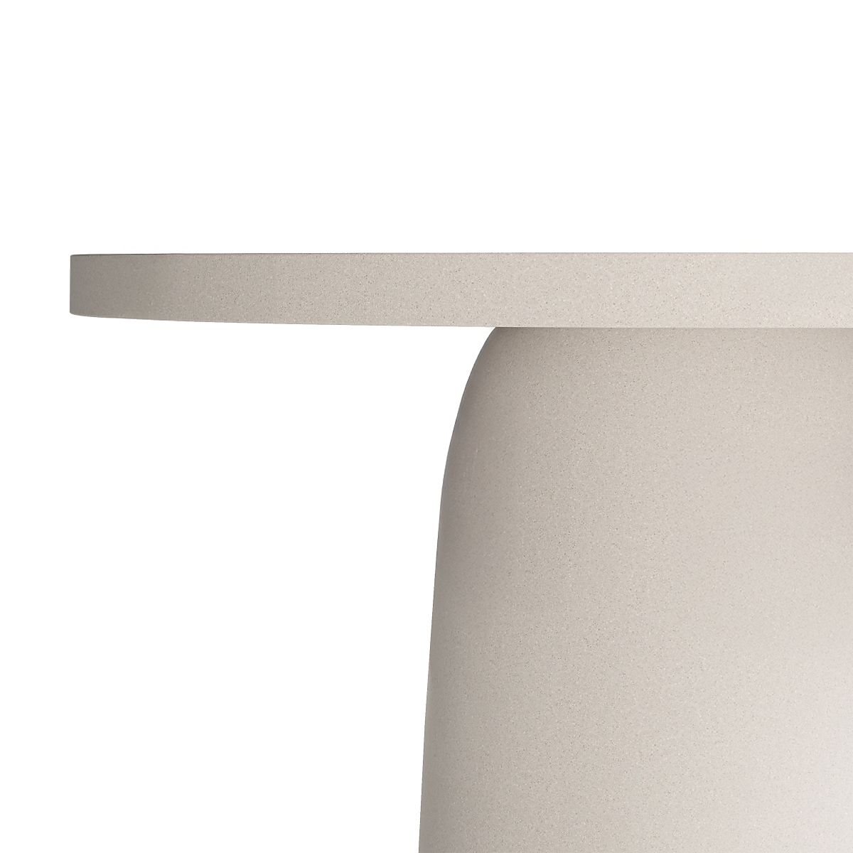 Round light beige garden table with a solid base. .. more