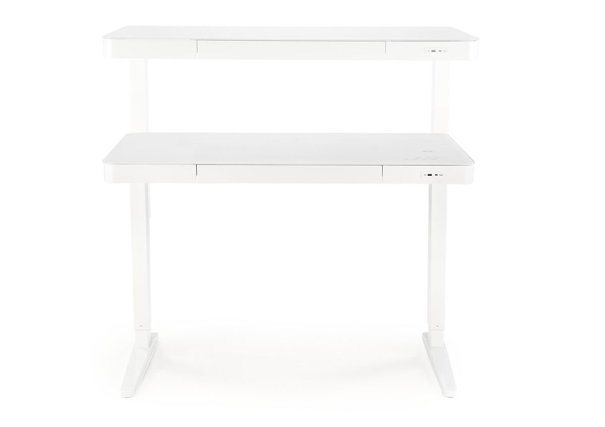 White table with height adjustment, touch screen, and wireless charging. .. more