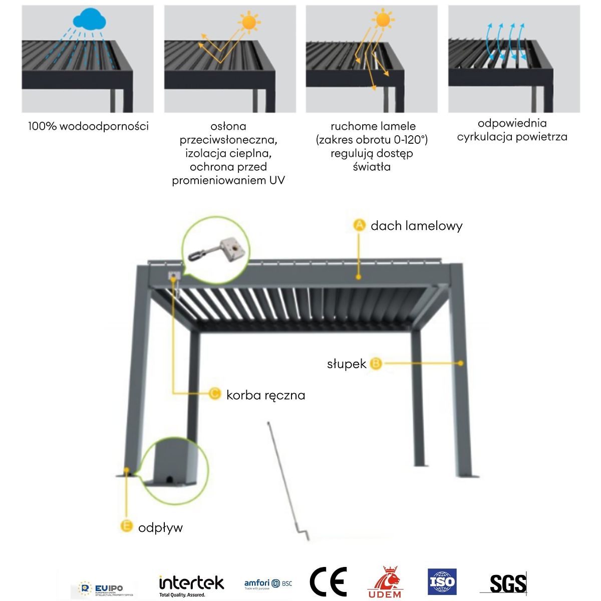 - Sturdy, corrosion-resistant aluminum construction, wind-resistant up to 120 km/h and snow load up to 60 kg/m²