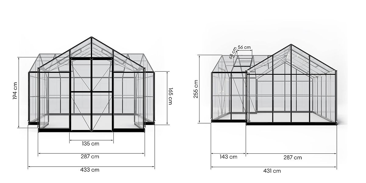 The orangery features a sturdy aluminum structure with a thickness of 1-2 mm, reinforced with stainless steel screws. Additional horizontal reinforcements on all walls and the roof ensure maximum stability. The Royal Green Standard offers excellent conditions for plant cultivation thanks to four tilting roof windows, which ensure proper ventilation and temperature regulation inside. The double sliding doors allow free entry, and the integrated gutter system with six drains efficiently channels rainwater, promoting eco-friendly plant cultivation.