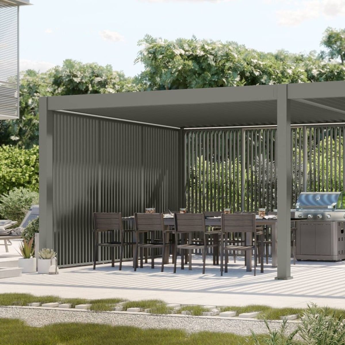 Freestanding aluminum pergola with LED lighting and remote-controlled louvers. .. more