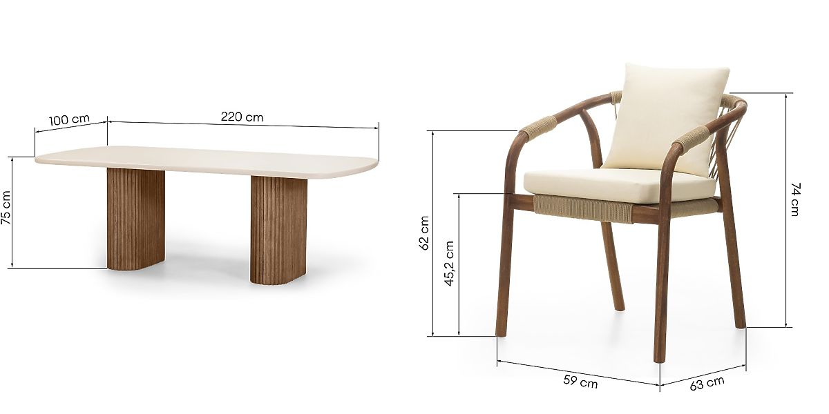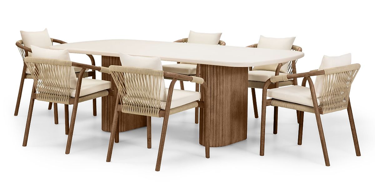 Create a space in your garden that captivates with both appearance and comfort! The Rovigo garden set is a unique combination of natural materials and original design, making every moment in the fresh air a pleasure. The centerpiece of the set is a table with a light beige top, made from the innovative Superstone material – a composite that perfectly imitates natural stone but is much more resistant to weather conditions and UV radiation. Its gently rounded edges add lightness, while the massive slatted legs made of acacia wood emphasize elegance and give a warm, natural character. The set includes six stylish chairs, whose rounded acacia wood frame ensures stability and durability. The woven backrests and seats, made from durable cord, not only attract attention but also ensure excellent air circulation. The set is completed with comfortable cushions that invite relaxation in the fresh air. The fabric used has hydrophobic properties, but to maintain its durability, we recommend storing it in a sheltered place during rain. Furniture made from natural wood retains its characteristic properties, so all unevenness, abrasions, scratches, knots, cracks, gaps, holes, dents, uneven edges, various textures, color differences, and other irregularities in the structure are intentionally preserved during the manufacturing process. These features highlight the authenticity of the material, giving each of our products a unique character, which may lead to differences in appearance compared to the presented photos. To keep the set in perfect condition for a long time, it is recommended to store it in a dry and airy place under a shelter during the winter months to protect it from weather conditions.