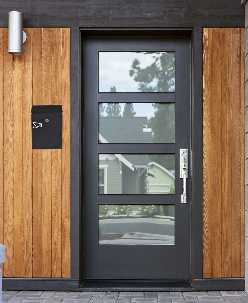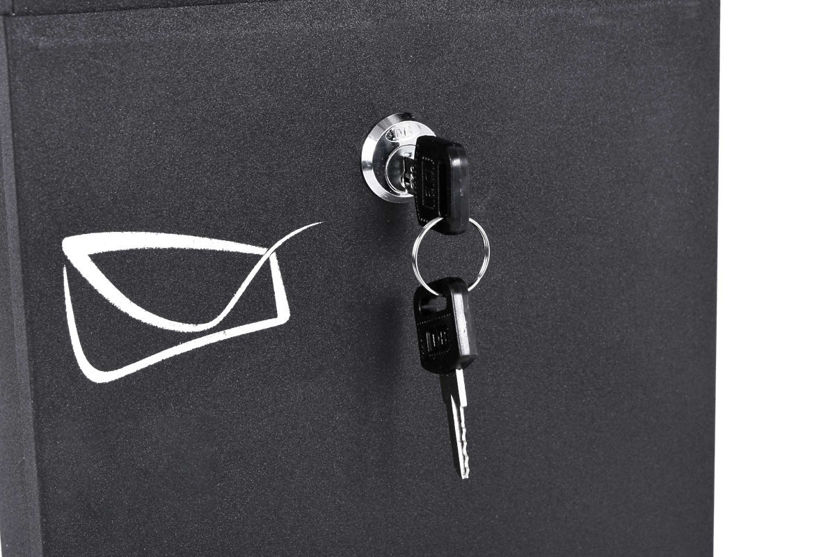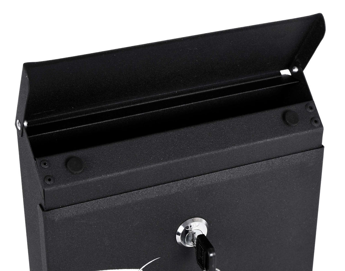 Durable black mailbox with key lock and weather resistance. .. more