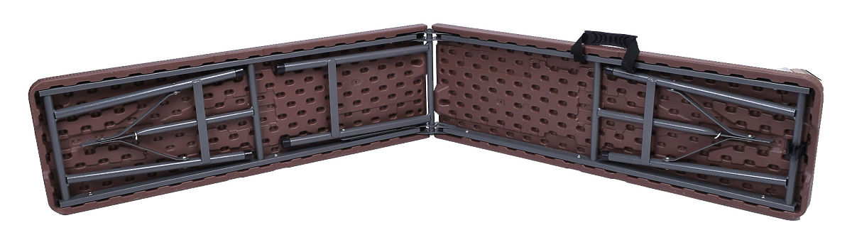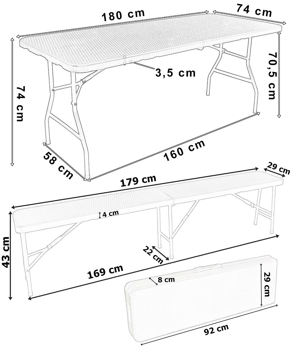 Catering Set Rattan Brown Table 180 cm + 2 Benches Purpose: Outdoor | Colors: Brown ⭐️ Pattern imitating rattan ⭐️ Tabletop and seats 100% waterproof ⭐️ Table and benches fold into suitcases ⭐️ Sturdy folding and unfolding system ⭐️ Purchase from the manufacturer Table Folding catering table. Very practical and lightweight. Frame made of powder-coated steel. Top made of HDPE polyethylene. Patterned like rattan. Resistant to sunlight. Thanks to its unique design, the entire frame hides into the tabletop, taking up little space and creating an ergonomic suitcase, easily portable. Bench The folding catering bench is very practical and durable. Frame made of powder-coated steel. Seat made of HDPE polyethylene. Patterned like rattan. Resistant to sunlight. Thanks to its unique design, the entire frame hides into the bench seat, taking up little space and creating an ergonomic suitcase, easily portable. Set Features For indoor and outdoor use HDPE material ensures high resistance to weather conditions and UV radiation Reliable and sturdy folding and unfolding system 100% waterproof Durability for many seasons Perfect for outdoor events, gardens, plots, camping, picnics. Fits well for everyday use. Dimensions: Table: Length 180 cm Width 74 cm Height 74 cm Leg spacing 58 cm x 160 cm Folded table (suitcase): Height 74 cm Width 93 cm Depth 7 cm Bench Dimensions: Length: 179 cm Width: 29 cm Height: 43 cm Suitcase dimensions: 92 x 29 x 8 cm Additional Information The presented colors are indicative - they may differ from the actual ones due to different monitor settings and photo editing processes. Actual dimensions may differ from those stated. Error tolerance may be +/- 5%. Brand: eHokery EAN code: 5905523069228 Color: Brown Material: Steel, HDPE
