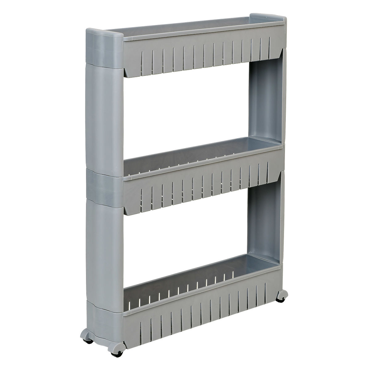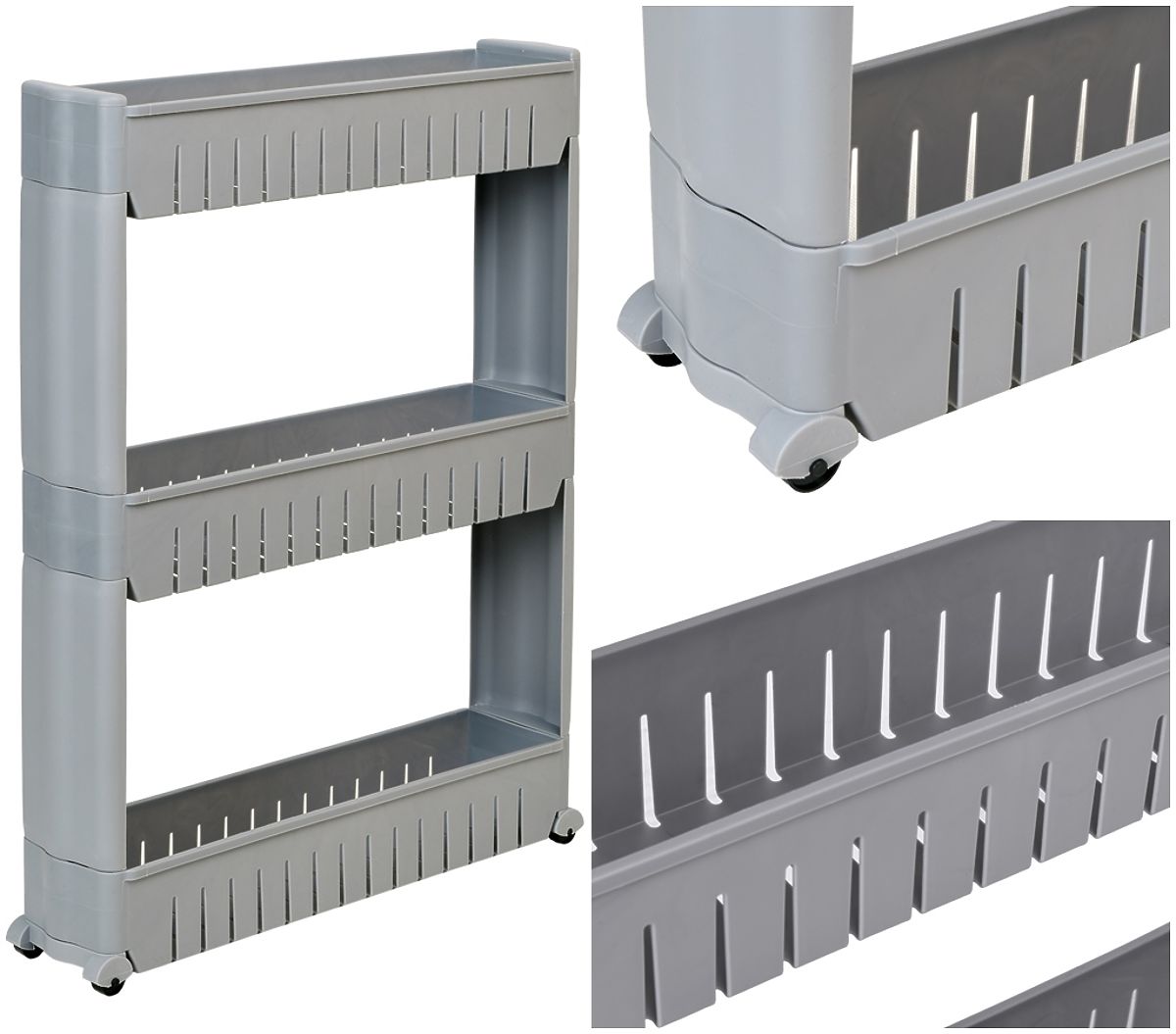 A mobile cabinet ideal for narrow spaces such as the kitchen or bathroom. Its modular design made of durable plastic allows easy customization to your needs – shelves can be added or removed. Thanks to its compact dimensions, it fits perfectly between a cabinet and a refrigerator, a washing machine, or other hard-to-reach places. The kitchen rack is perfect for storing spices, kitchen accessories, cosmetics, cleaning products, and many other essentials. Mobility is ensured by four wheels, making the bathroom cabinet on wheels easy to move where needed.