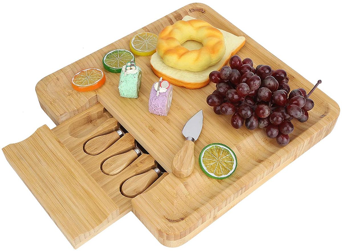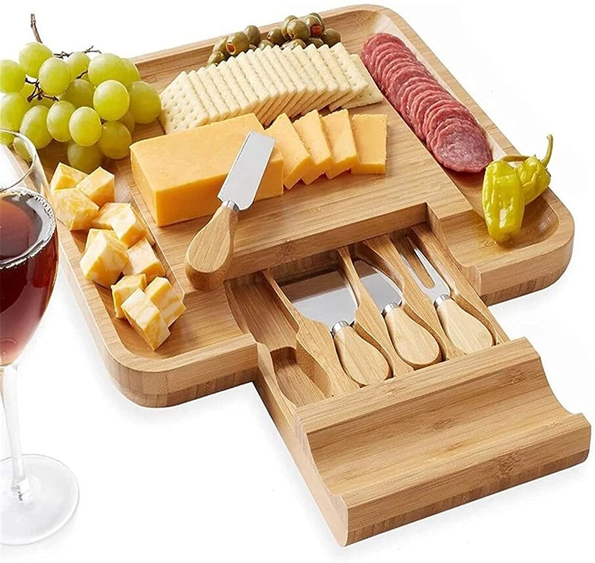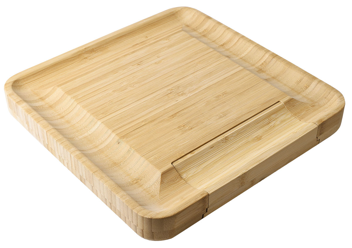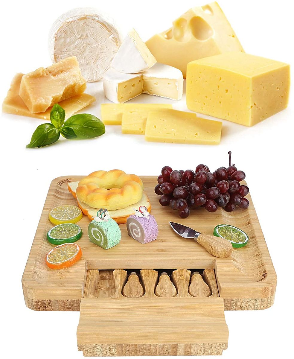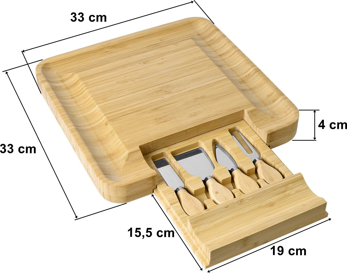 Made from 100% high-quality bamboo wood. A great gift idea for cheese lovers and more. The board is equipped with a drawer containing a set of stainless steel knives. Grooves on the edges allow for an impressive arrangement of snacks and side dishes. Additional accessories make it easier to serve and cut snacks and maintain order on the table. The board is perfect for any party or gathering with friends. It will be a great gift accessory.