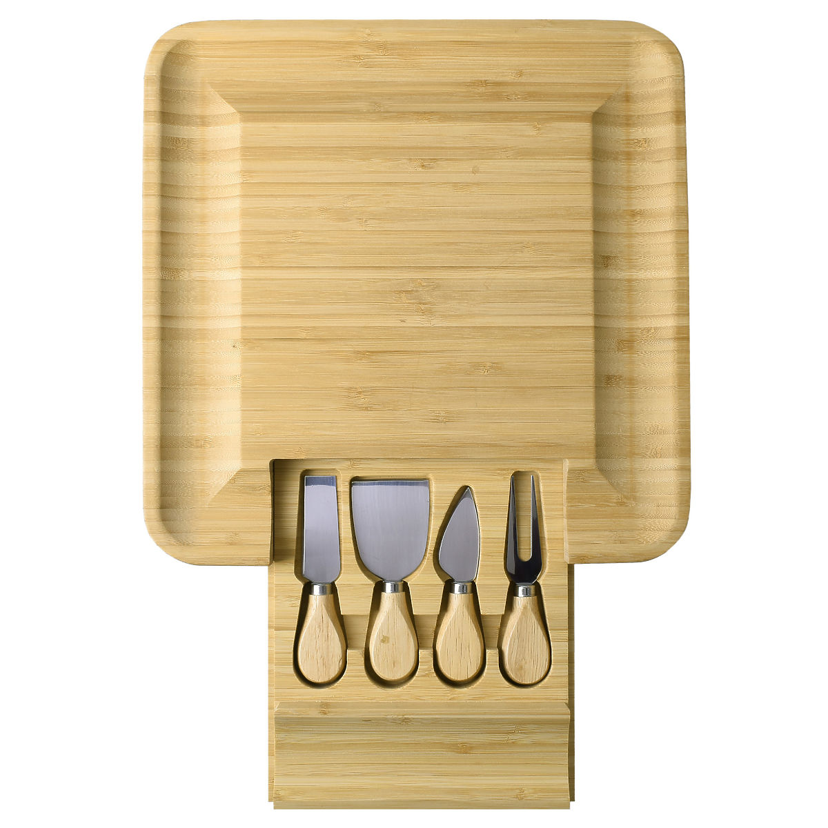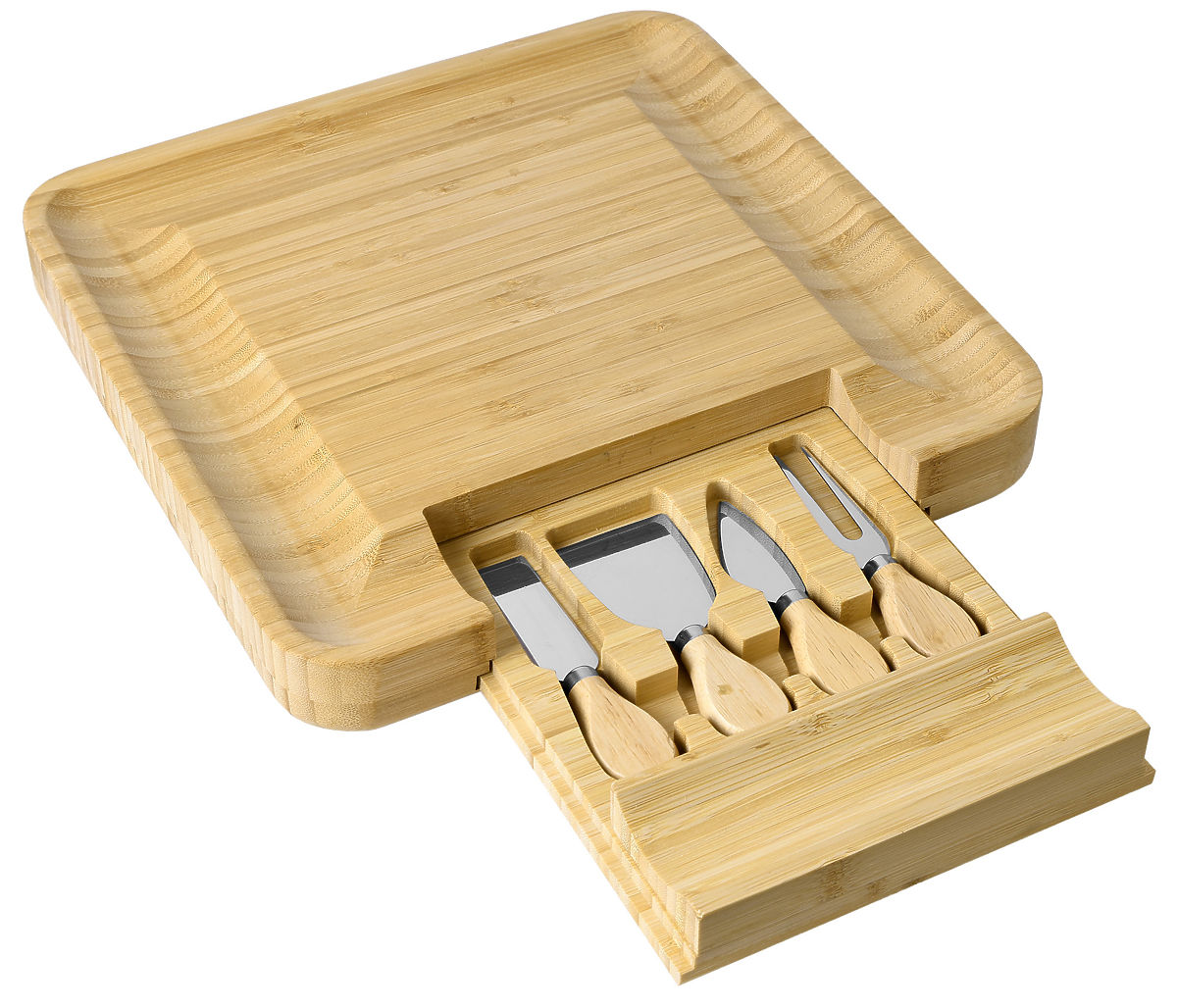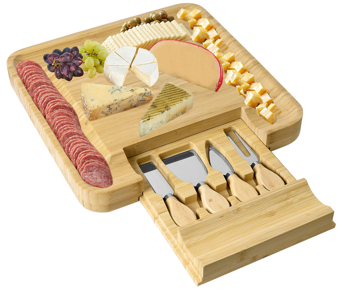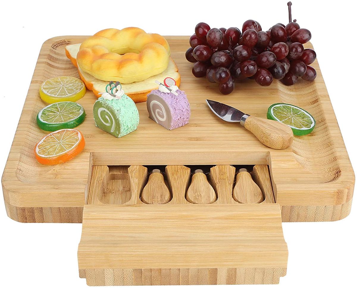 Made from 100% high-quality bamboo wood. A great gift idea for cheese lovers and more. The board is equipped with a drawer containing a set of stainless steel knives. Grooves on the edges allow for an impressive arrangement of snacks and side dishes. Additional accessories make it easier to serve and cut snacks and maintain order on the table. The board is perfect for any party or gathering with friends. It will be a great gift accessory.