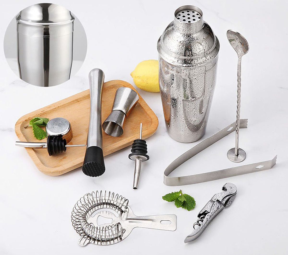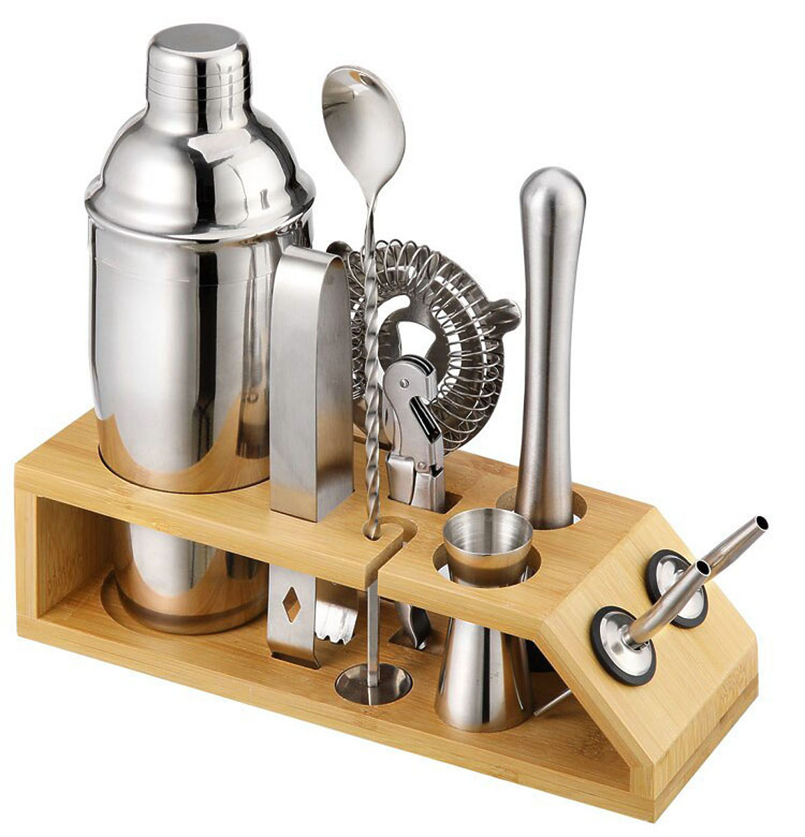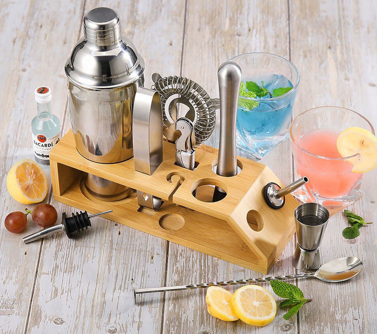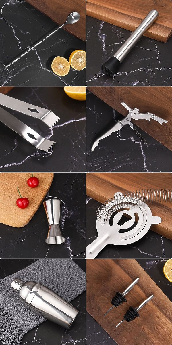 If you want to give yourself or someone else an exceptional gift, you are in the right place. The Bradford bartender set consists of a carefully crafted bamboo stand and nine stainless steel accessories. This is important information because steel does not react chemically and does not alter the taste of the served drinks and beverages. Thanks to this, they taste exactly as they should.