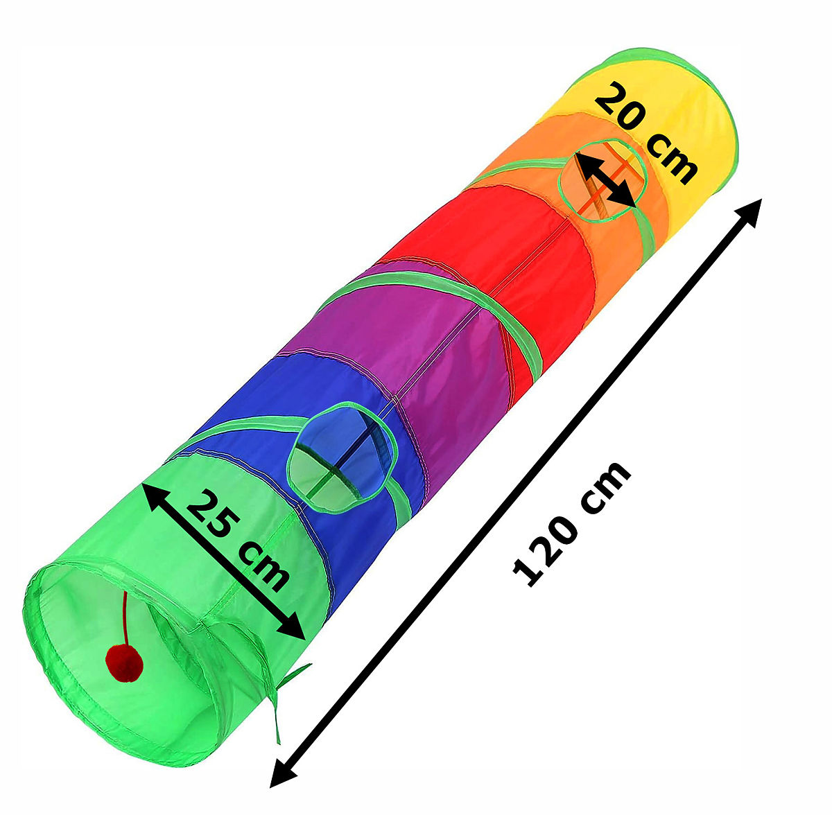 The spring tunnel for cats is an indispensable toy that will provide your pet with many hours of joy. It encourages their curiosity and stimulates activity. The rustling sounds made by the tunnel further attract the interest of kittens and invite them to play. The tunnel with two windows offers great fun and can also serve as a safe hideaway where your cat can rest and feel secure. Whether you're at home or in the garden, this tunnel proves to be perfect. On one side, it has an additional hanging toy, ending with a furry pom-pom, a favorite toy of small predators. Another advantage is its size - 120 cm does not take up much space in the house while providing shelter and fun for several cats at the same time. The tunnel can be easily folded flat and conveniently transported anytime. It takes up very little space thanks to its 25 cm diameter, so you can easily take it with you wherever you go. It's the perfect gift for a cat pet!
