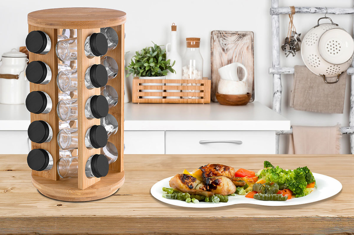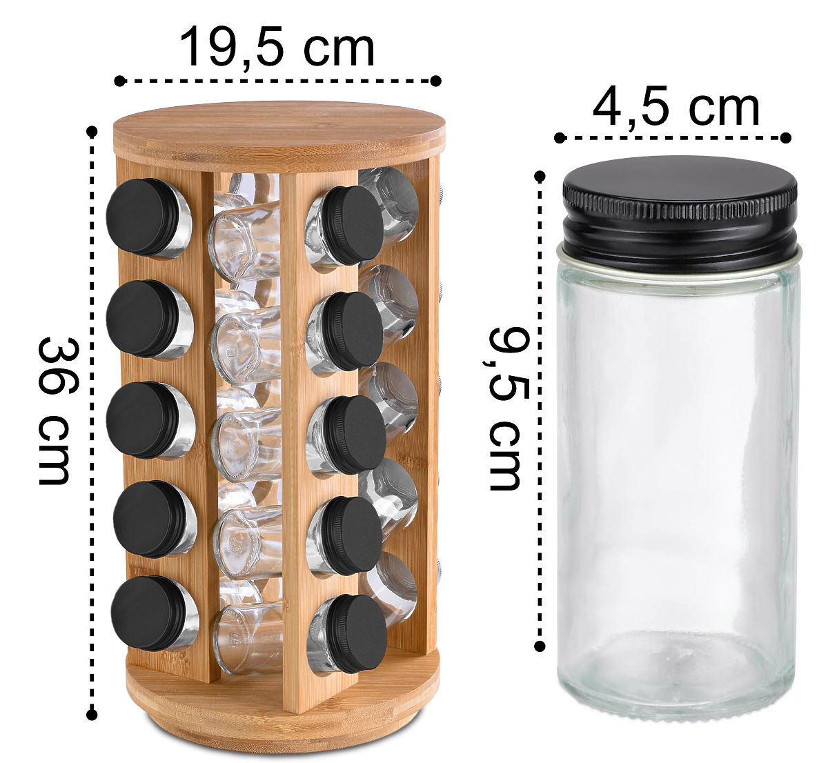 ✅20 glass containers: The spice rack is equipped with 20 transparent glass containers that allow for a quick view of the contents. This is an ideal solution for easy identification of the right spice and preventing unnecessary lid openings.