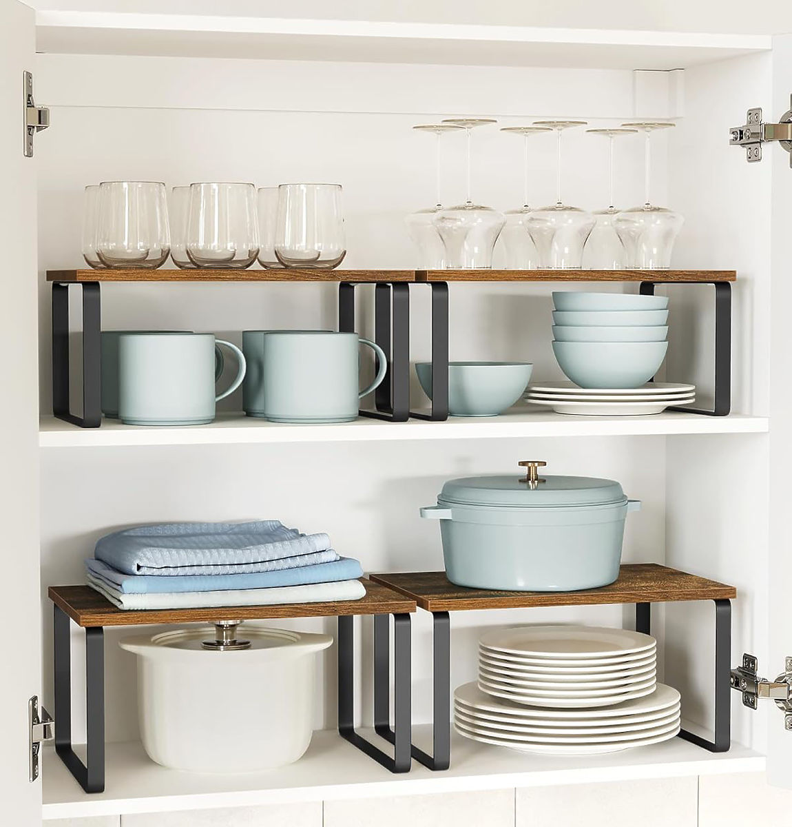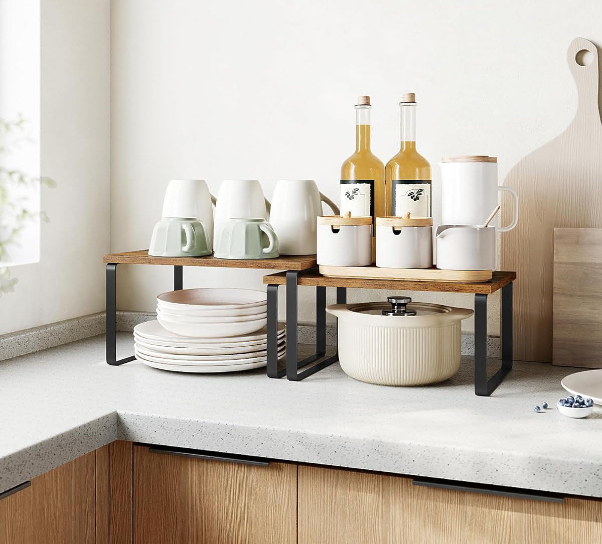 The shelf design allows for various configurations – you can place them side by side, stack one on top of the other, arrange them in an "L" shape, or slide the smaller shelf into the frame of the larger one, enabling efficient use of space.