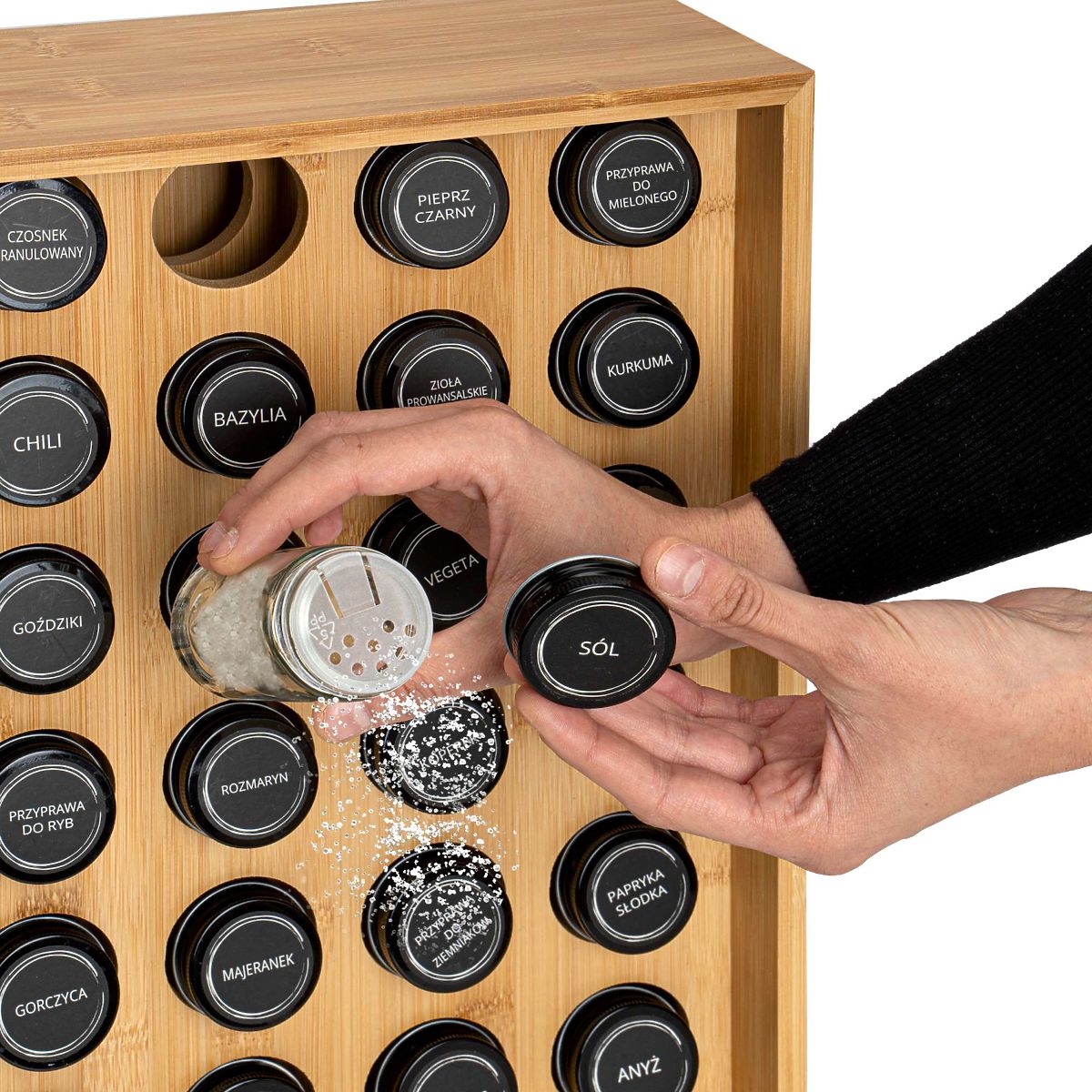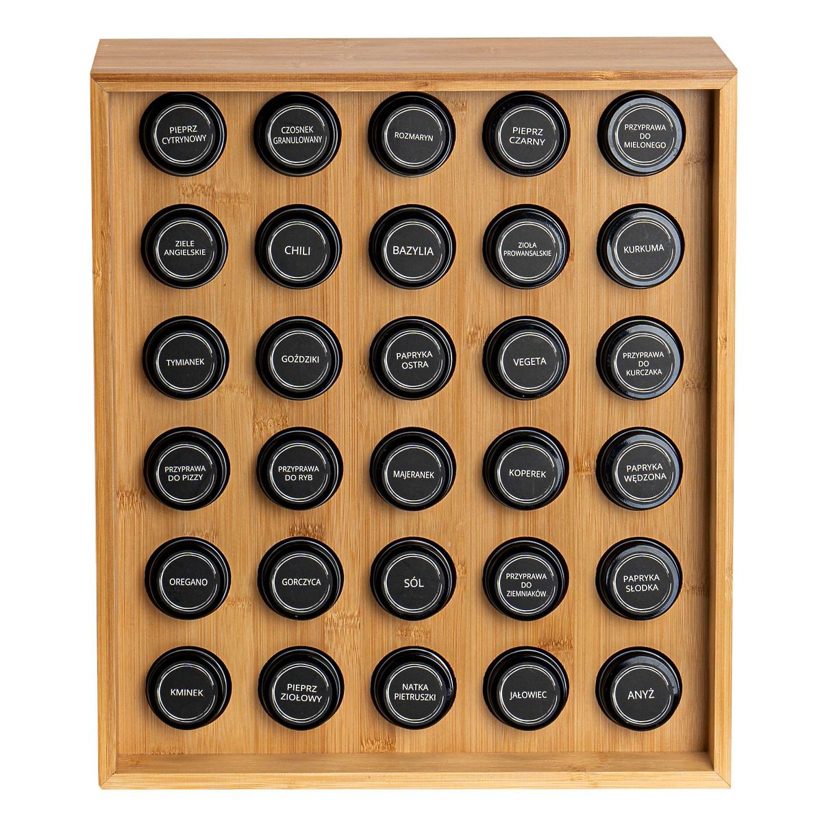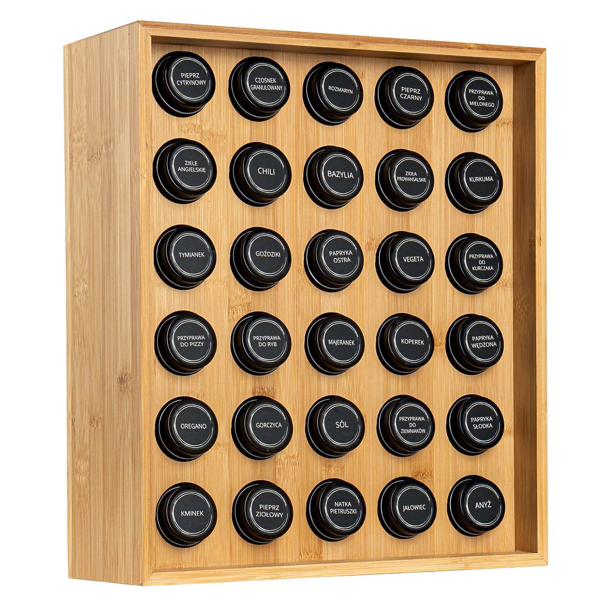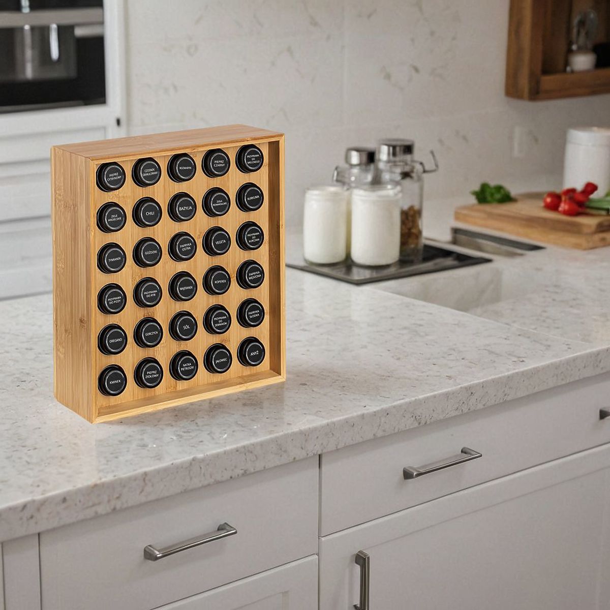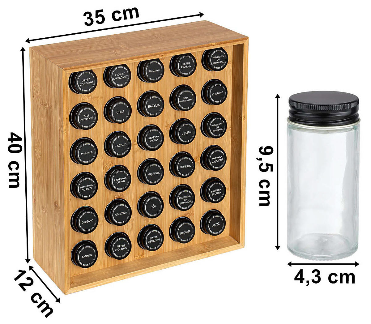 SAFRAN Natural Spice Rack Purpose: Kitchen | Color: Natural | Number of jars: 30 The Safran Natural Spice Rack is an exceptional addition to any kitchen, combining elegance with functionality. Made from sturdy bamboo, it is not only durable but also eco-friendly. With 30 jars and spice labels, maintaining order is very easy. This modern rack is not only a practical solution but also a decorative element that adds character to your kitchen. Why choose Safran Natural? ✔️ Durable bamboo – long-lasting and natural material ✔️ Set of 30 jars – complete spice organization ✔️ Labels with spice names – easy identification ✔️ Elegant appearance – ideal for modern interiors ✔️ Easy maintenance – simple cleaning Organize your kitchen elegantly with Safran Natural! ✅ Specifications Stand material: Bamboo wood Jar material: Glass + metal lid Label material: Polyethylene (PE) Product weight: 5.67 kg Number of labels: 72, including 12 for personal addition. ✅ Dimensions Stand height: 40 cm Stand width: 35 cm Stand depth: 12 cm Jar diameter: 4.3 cm Jar height with lid: 9.5 cm Additional Information The colors shown are indicative and may differ from actual colors due to different monitor settings and photo editing processes. Actual dimensions may vary from those listed above. Error tolerance may be +/- 5%. Brand: Gockowiak EAN code: 5902340330708 Color: Natural Height: 40 cm Width: 35 cm Depth: 12 cm Number of jars: 30 pieces
