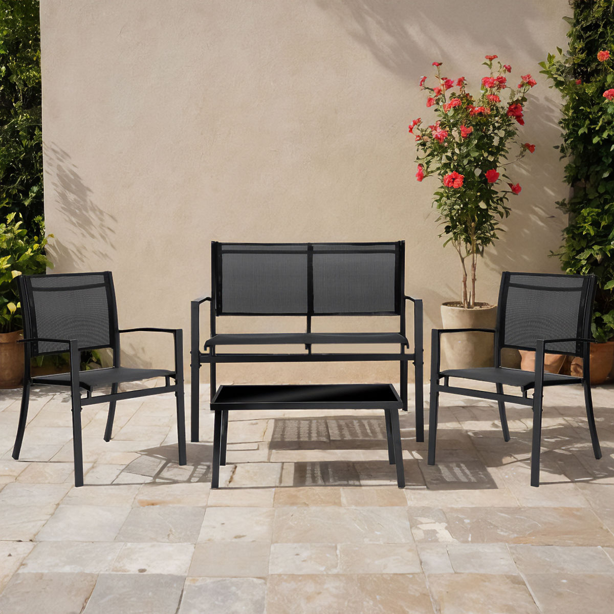Garden Furniture Set GRACIOSA BLACK Model: 4v1 | Color: Matte Black The Graciosa garden furniture set is an excellent choice for those who value comfort and durability in their garden or on their terrace. Made from the highest quality materials, such as powder-coated steel and durable Textilene material, it ensures not only a stylish appearance but also durability and easy maintenance. The set includes: a two-seater sofa, two armchairs, and a table with a tempered glass top, creating the perfect ensemble for relaxing in the fresh air. Product Features ✅ Perfect furniture set for garden and terrace ✅ Made from the highest quality materials ✅ Table equipped with a tempered glass top ✅ Modern, stylish design ✅ Exceptional comfort in use ✅ Carefully crafted, aesthetic appearance Specifications Frame material: powder-coated steel Backrest and seat material: Textilene plastic Set contents: sofa, table, two armchairs Intended use: garden, terrace Maximum sofa load: 200 kg Maximum armchair load: 100 kg Maximum table load: 10 kg Set weight: 22.6 kg Additional Information The colors shown should be considered indicative - they may differ from the actual ones due to different monitor settings and photo editing processes. Actual dimensions may vary from those listed above. Error tolerance may be +/- 5%. The chair legs can be additionally adjusted in level. Brand: eHokery Product Code: 5902340330807 Color: Matte Black In the set: sofa, two armchairs, table Seat Material: Textilene Frame Material: powder-coated steel Tabletop: glass Intended Use: garden, terrace Self-assembly: yes
