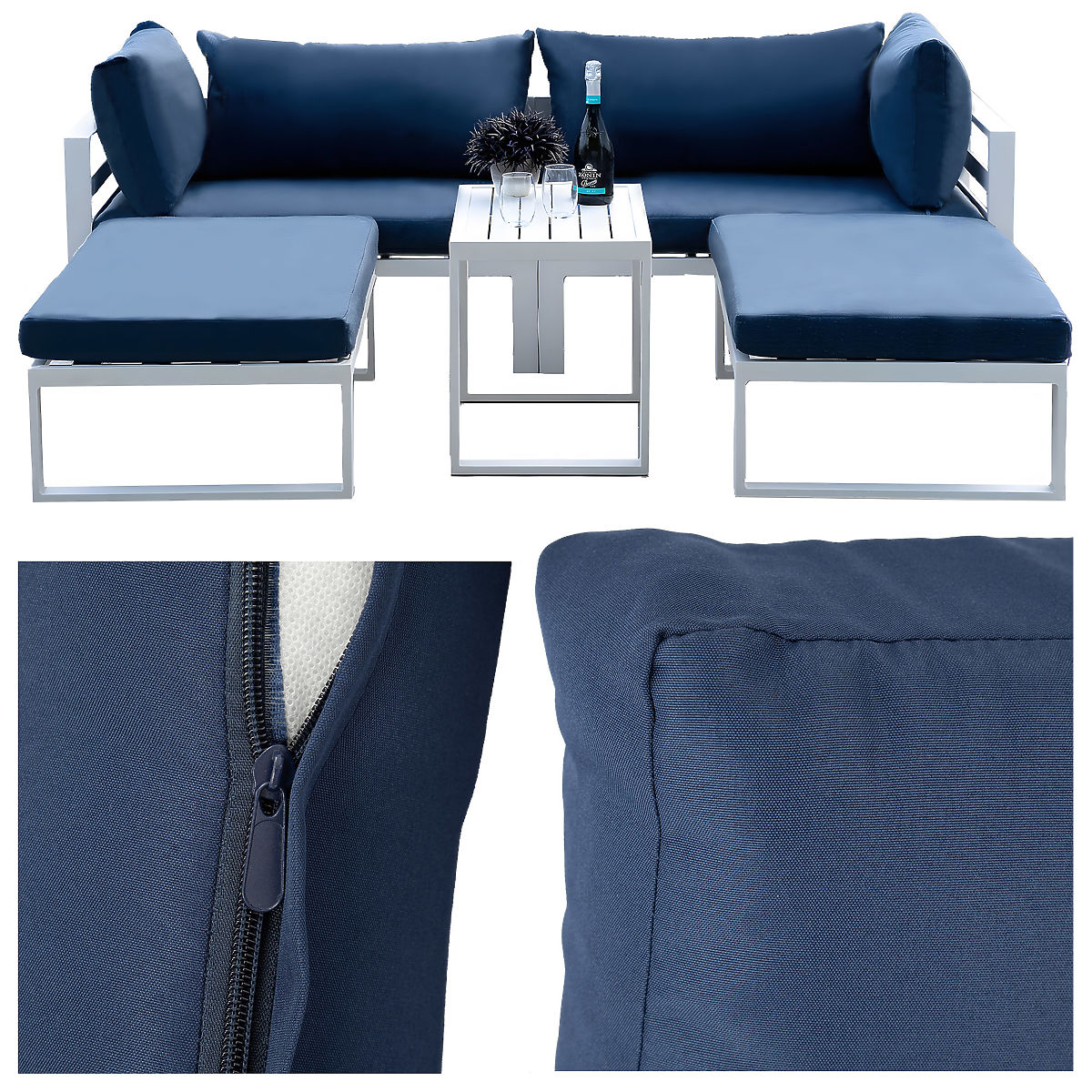 SANTO White Garden Furniture Set Model: SANTO | Furniture Color: White ⭐ Garden Furniture Set ⭐ Includes: 2 sofas, 2 ottomans, 1 table, 8 cushions ⭐ Modular system ⭐ Flexible furniture arrangement ⭐ Purchase directly from the manufacturer ☀️ Santo White Furniture Set - elegance and comfort in your garden ☀️ ➡️ Color: White/Blue The Santo garden furniture set in white is the perfect solution for those who want to enjoy comfort and style outdoors. Thanks to its modular design, you can customize the furniture arrangement to your needs, creating the ideal spot for relaxation or gatherings with family and friends. The high-quality materials, such as powder-coated aluminum, ensure durability and easy maintenance. Removable covers make cleaning easy, and the adjustable legs and module fastening system provide stability and comfort during use. By choosing the Santo set, you gain not only an elegant appearance but also functionality and durability that will meet all your expectations. ✅ Made from powder-coated aluminum ✅ Modular design - flexible furniture arrangement ✅ Comfortable cushions with zip closures ✅ Non-slip cover pads ✅ Easy maintenance ✅ Adjustable legs ✅ Modern design ✅ Ready to use ☑️ Specifications: Frame Material: Powder-coated aluminum Cushion Material: Polyester Removable cushion covers: With zippers Modular design! Legs: Adjustable Set Contents: 2 sofas - left and right, 2 ottomans, 1 table, 8 cushions and covers, module connection set Assembly: Furniture is delivered assembled, no assembly required Color: Frame - White, Cushions - Blue ☑️ Dimensions: Table: Height 51 cm x Width 68.5 cm x Depth 42 cm One Sofa: Height 59 cm x Width 112.5 cm x Depth 68.5 cm One Ottoman: Height 29 cm x Width 106 cm x Depth 65.5 cm Seat Cushion: 105 x 66 x 11 cm Back Cushion: 89 x 40 x 19 cm Side Cushion: 69 x 40 x 19 cm Maximum table load: 30 kg Maximum module load: 130 kg ✅ Made from powder-coated aluminum The set is made from powder-coated aluminum, ensuring exceptional durability and resistance. ✅ Modular design - flexible furniture arrangement Furniture can be configured freely, adaptable to your needs and space size. ✅ Comfortable cushions with zip closures Comfortable seats with cushions that can be easily removed and washed thanks to zippers. ✅ Non-slip cover pads Thanks to the non-slip layer, cushions stay in place even with frequent use, preventing them from shifting or slipping off the seats. ✅ Adjustable legs Adjustable legs and module fastening system ensure stable positioning on any surface. ✅ Ready to use Furniture requires no assembly, delivered assembled for immediate use. * Colors shown in the offer are indicative - they may differ from actual ones due to different monitor settings and photo editing processes. * Note! Actual dimensions may differ from those stated in the offer. Error tolerance may be +/- 5%. Brand: eHokery Product Code: 331514MG EAN Code: 5902340331514 Furniture Color: White Frame Material: Aluminum Cover Material: Polyester Intended Use: Garden | Terrace | Balcony Removable Covers: Yes