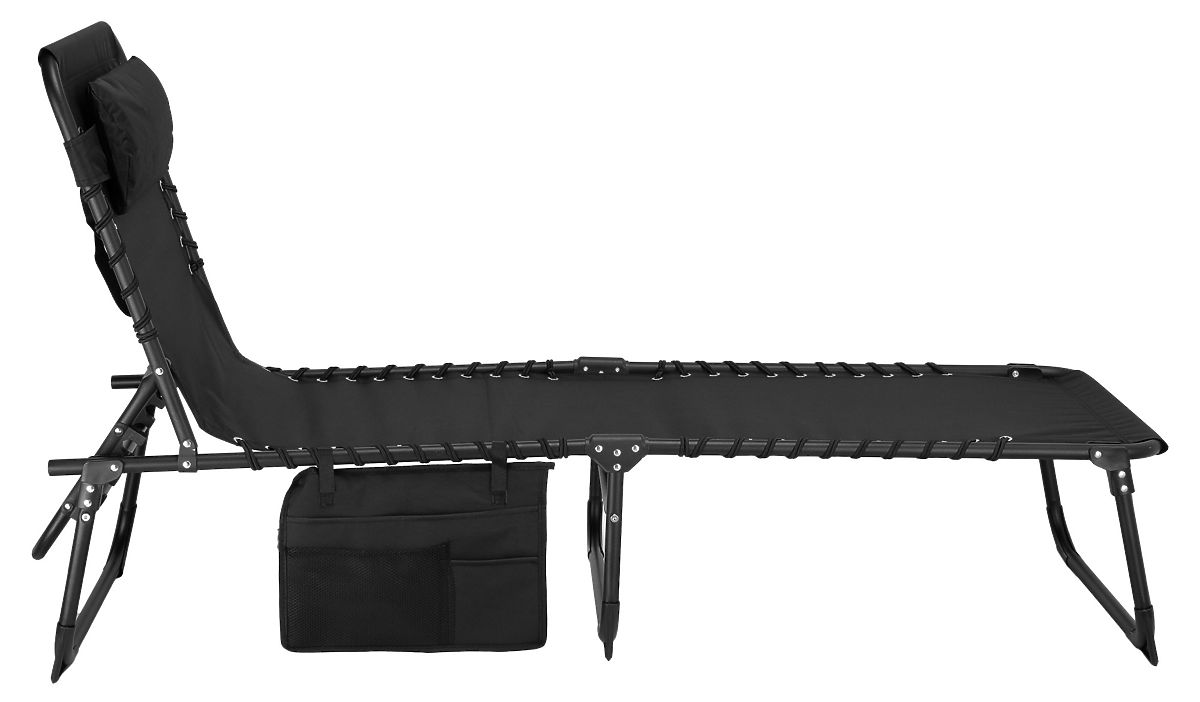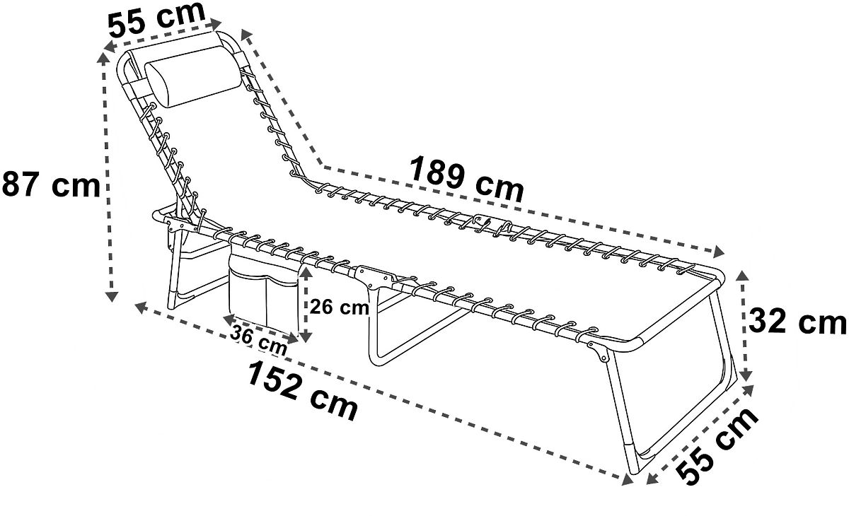 FOLDING GARDEN LOUNGER FENIKS BLACK Purpose: Outdoor relaxation | Color: Black The Feniks lounger guarantees comfortable relaxation. Its stable construction, adjustable backrest, and soft pillow ensure that relaxation takes on a new dimension. Despite its sturdy steel construction, it is lightweight, easily portable, and foldable. It is perfect for the garden, balcony, or weekend trips. Whether you want to recharge after a long day or spend a lazy afternoon in nature, the Feniks Lounger will be the perfect companion for your relaxation. Product features: ✅ Adjustable backrest ✅ Comfortable pillow ✅ Powder-coated steel ✅ Non-slip feet ✅ Maximum load up to 150 kg ✅ Ready to use ✍️ Specifications: Maximum permissible load: 150 kg Frame material: Powder-coated steel Backrest adjustment: 5-level Non-slip feet Weight: 5.7 kg ✍️ Dimensions: Length: 189 cm Width: 55 cm Maximum backrest height: 87 cm Height: 32 cm Additional information The colors shown are indicative and may differ from the actual ones due to different monitor settings and photo editing processes. Actual dimensions may differ from those listed above. Error tolerance may be +/- 5%. Brand: eHokery Product EAN code: 5905523067118 Color: black Height: 87 cm Width: 55 cm Length: 189 cm Backrest adjustment: 5-level