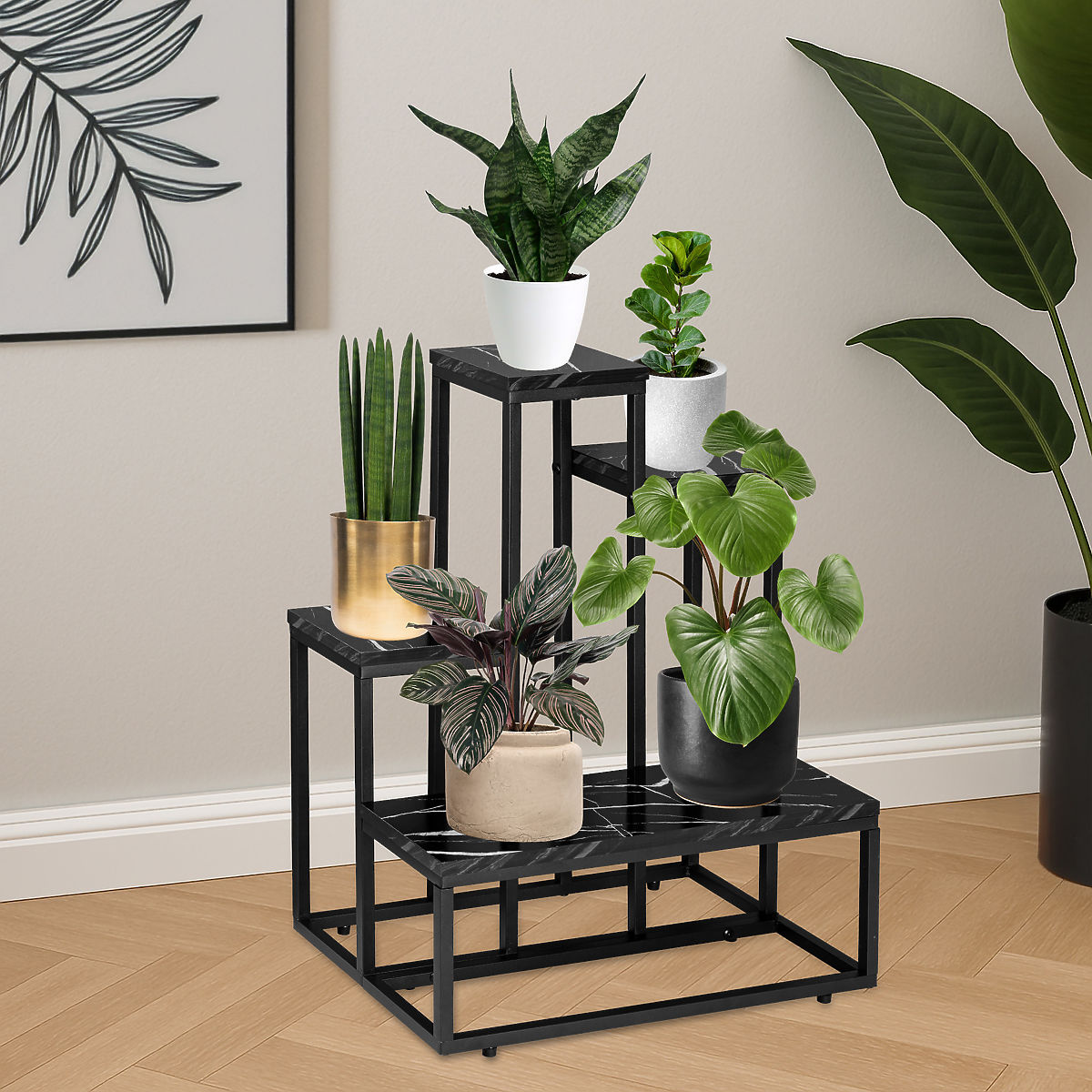 ✔️ Marble elegance – laminated shelves in black marble color give the flower stand a luxurious character. The laminated surface not only looks elegant but also beautifully highlights plants and decorations.