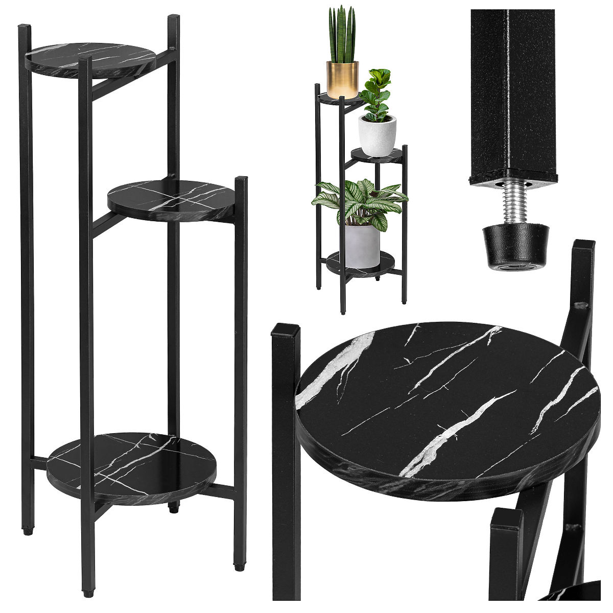 TRETORRI Black Marble Plant Stand Model: Tretorri | Color: Black Marble Tretorri is a robust plant stand made from steel profiles coated with powder paint and laminated boards imitating marble. It features a simple design and attractive appearance that fits into any modern interior styled in loft, modern, or glamour. ✔️Specifications: Construction: steel coated with powder paint Shelf: laminated, glossy, marble imitation Maximum load: 15 kg ✔️Dimensions: Total height 80.5 cm Total width 35 cm Total depth 35 cm Diameter of large shelf: 25 cm Diameter of small shelves: 19 cm Board thickness 1.5 cm Construction profile 1.5 cm Additional Information Displayed colors are indicative - they may differ from actual ones due to different monitor settings and photo editing processes. Actual dimensions may differ from those listed above. Error tolerance may be +/- 5%. Brand: LoftInspired EAN product code: 5905523068337 Color: black marble Total height: 80.5 cm Total width: 35 cm Shelf diameter: 19 cm Self-assembly: yes