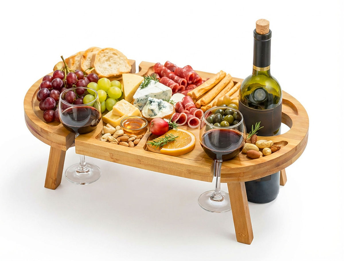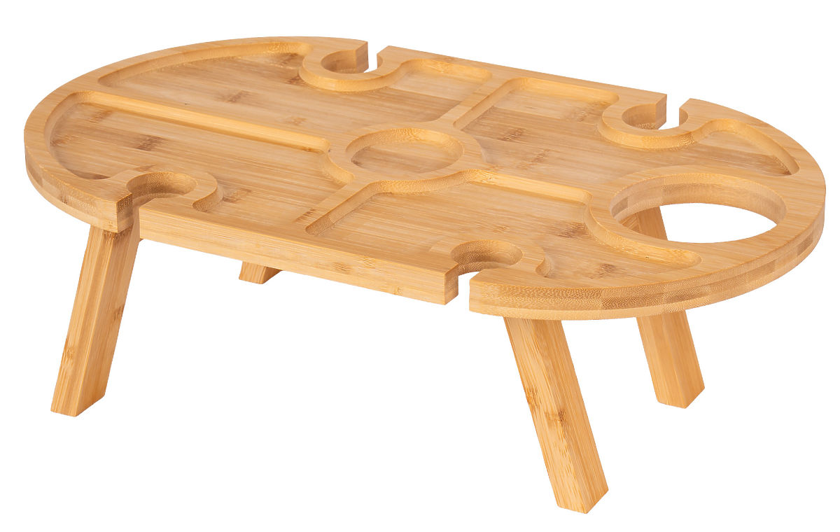 Natural bamboo serving board with foldable legs and multiple sections. .. more