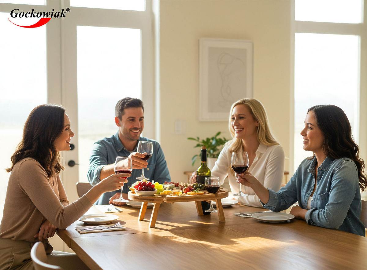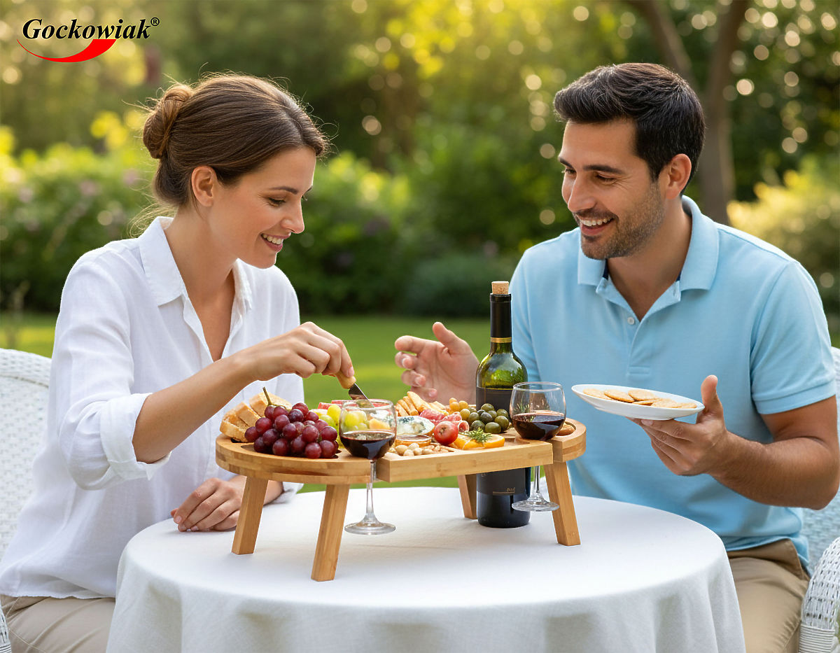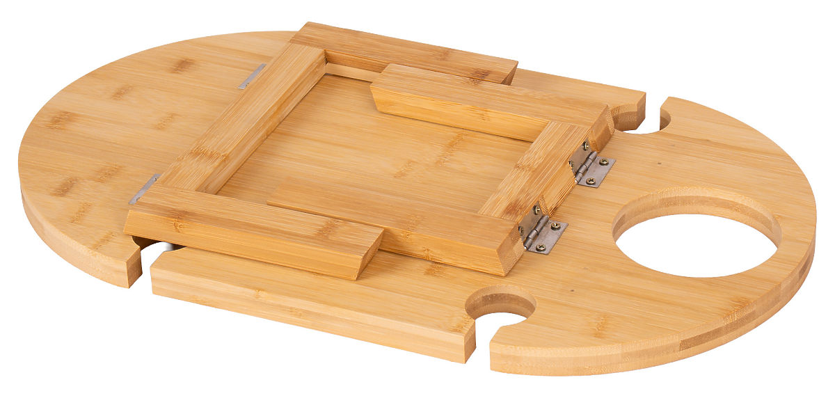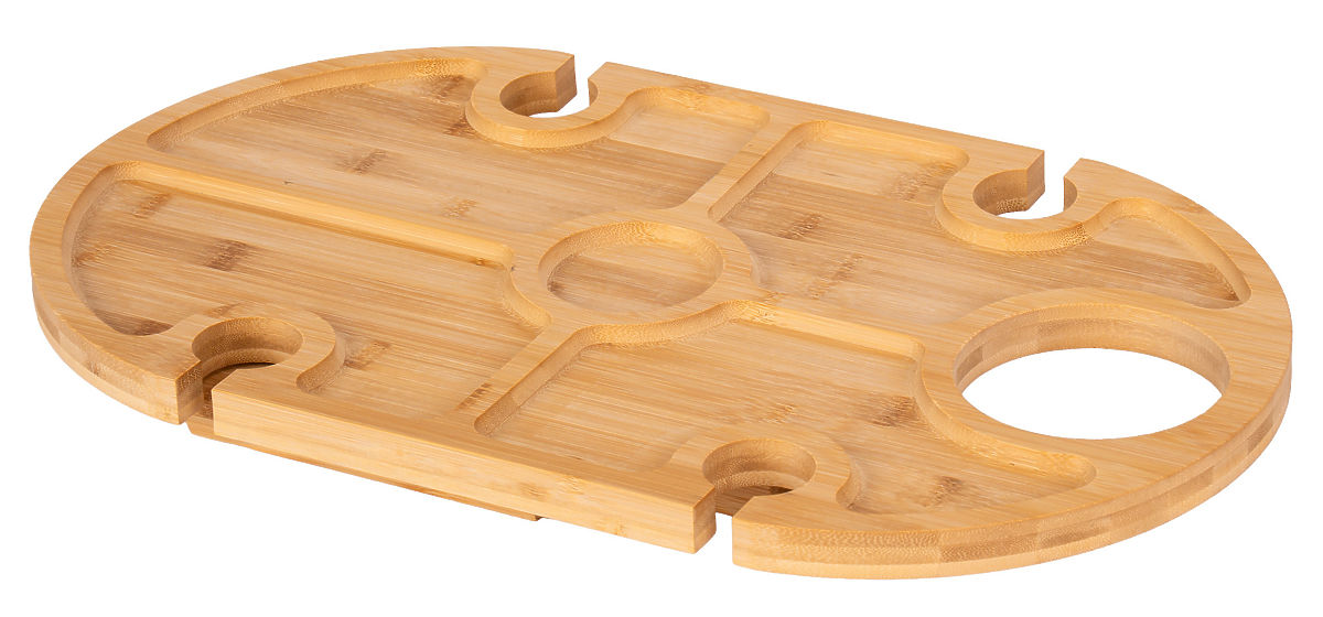 Bamboo Serving Board DELIA Model: DELIA | Material: 100% Bamboo | Color: Natural ⭐️100% Bamboo ⭐️Foldable Legs ⭐️4 Snack Sections ⭐️Dip Space ⭐️Bottle Space ⭐️4 Glass Spaces ⭐️Purchase from Manufacturer ✔️ Specifications: Material: 100% Bamboo Foldable Legs: Yes Section Division: Yes, 4 Sections + Dip Space Glass Cutouts: Yes, 4 Bottle Space: Yes, 1 Color: Natural Brand: Gockowiak ✔️ Dimensions: Height When Folded: 4.2 cm Height with Legs Extended: 17 cm Length: 50 cm Width: 30 cm Edge Thickness: 2 cm Bottle Space: 9.8 cm Dip Space: 7 cm Glass Space: 4 cm Additional Information The displayed colors are indicative - they may differ from actual ones due to various monitor settings and photo editing processes. Actual dimensions may differ from those listed above. Error tolerance may be +/- 5%. Brand: Gockowiak EAN Product Code: 5902340330388 Color: Natural Length: 50 cm Width: 30 cm Edge Thickness: 2 cm Bottle and Glass Space: Yes