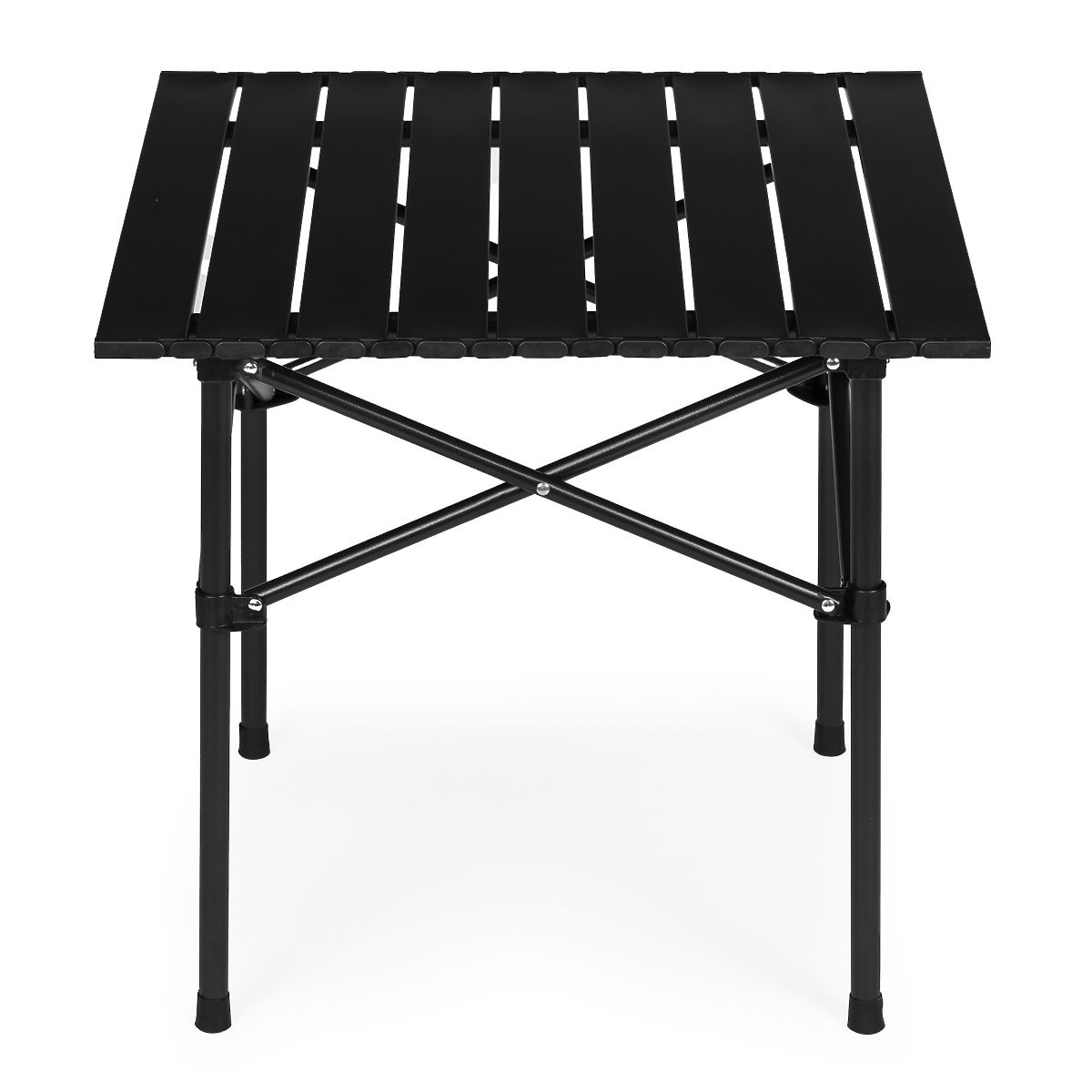 Folding camping table with a carbon steel frame and roll-up tabletop. .. more