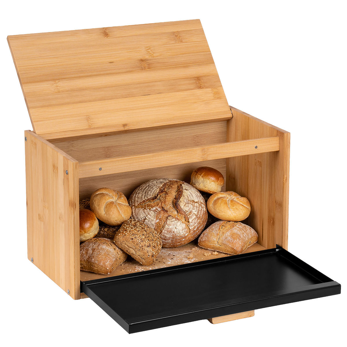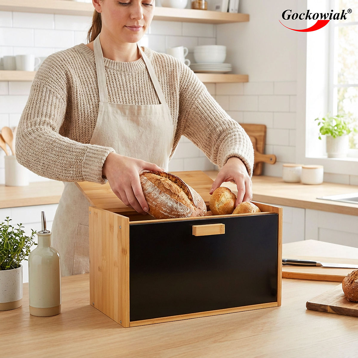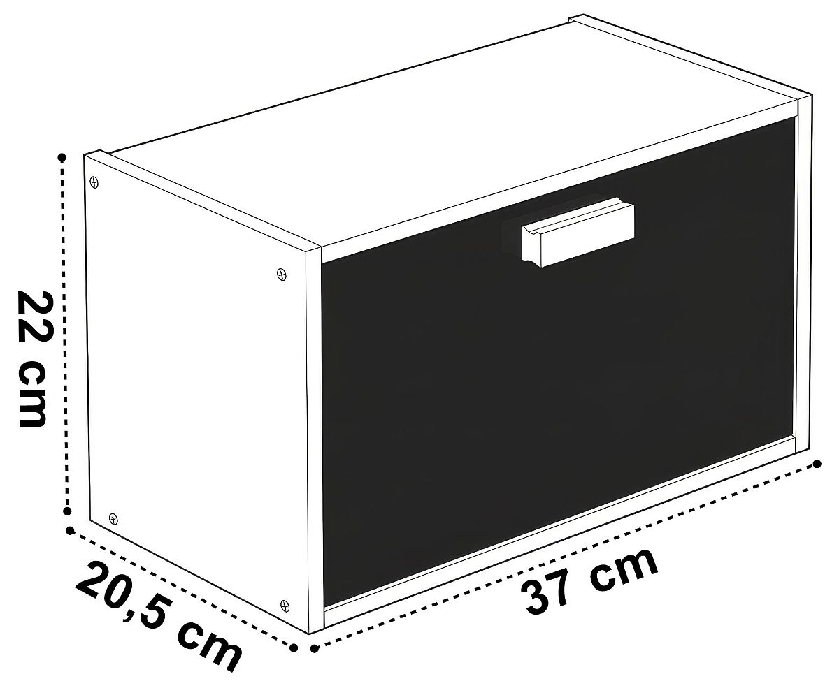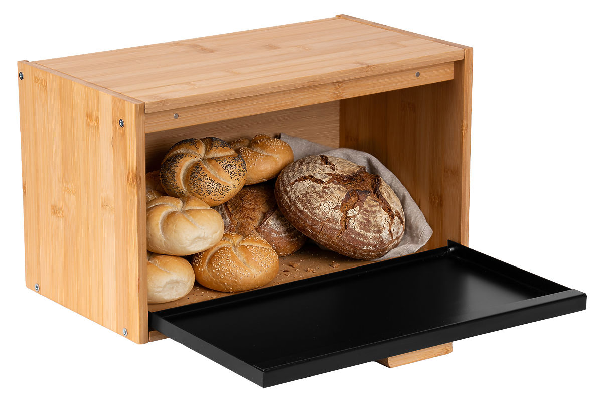 Bamboo Bread Box CHARLES Model: CHARLES | Material: Bamboo+metal | Usage: Kitchen ⭐️Bamboo + metal ⭐️Magnetic drop-down door ⭐️Openable top lid ⭐️Non-slip feet ⭐️Modern design ⭐️Purchase from manufacturer ✏️ Specifications: Material: bamboo + metal Door: drop-down, magnetic Door color: matte black Top lid: openable Feet: 4 non-slip Assembly: self-assembly ✏️ Dimensions: Height: 22 cm Width: 37 cm Depth: 20.5 cm Additional information The colors shown are indicative - they may differ from actual colors due to different monitor settings and photo editing processes. Actual dimensions may differ from those listed above. Error tolerance may be +/- 5%. Brand: Gockowiak EAN product code: 5902340332443 Color: natural / black Height: 22 cm Width: 37 cm Depth: 20.5 cm