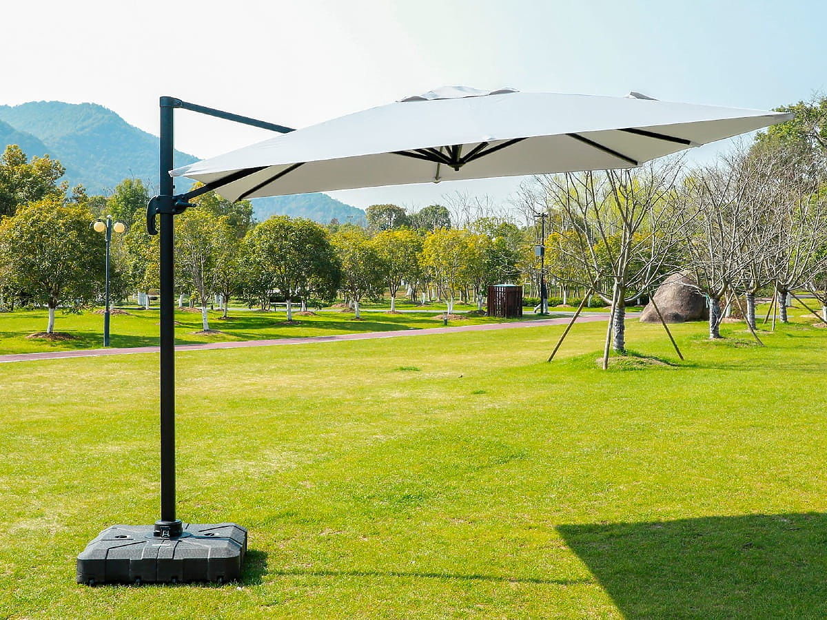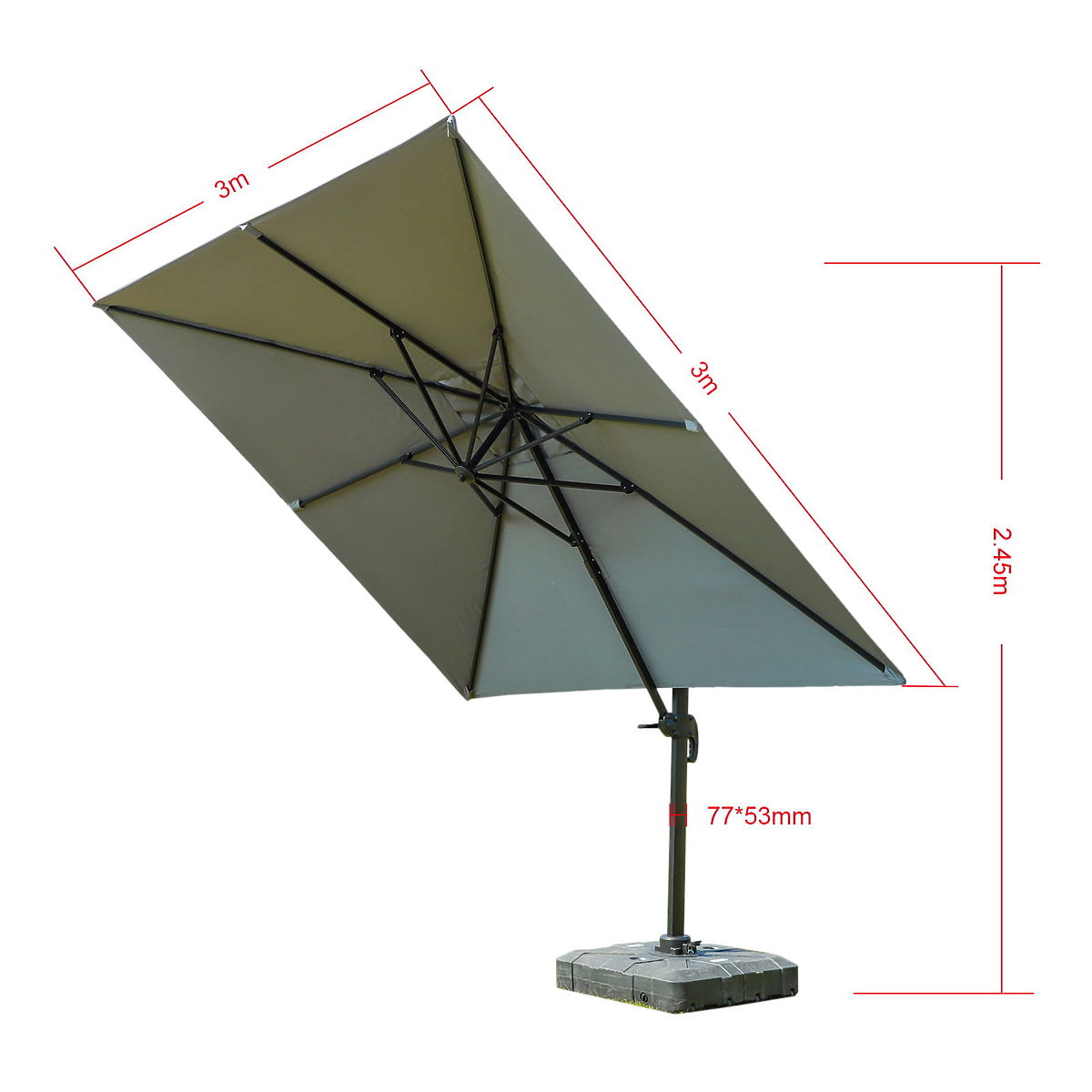 The garden parasol is the perfect combination of style and functionality. This large parasol not only effectively protects against harmful sun rays but also serves as an exceptional decoration. With easy angle adjustment, you can adapt the parasol to your needs, ensuring maximum protection and comfort. The terrace parasol features a 100% polyester cover, guaranteeing durability and resistance to various weather conditions, including moisture and UV radiation. Simple crank operation allows for quick folding and unfolding, making it an ideal choice for anyone who values convenience and quality. Parasol color: ecru Shape: square Cover material: 100% polyester Parasol construction: aluminum 1 x parasol: dimensions: 300 cm x 300 cm height: 245 cm The parasol base is included in the set - the base has a water tank!