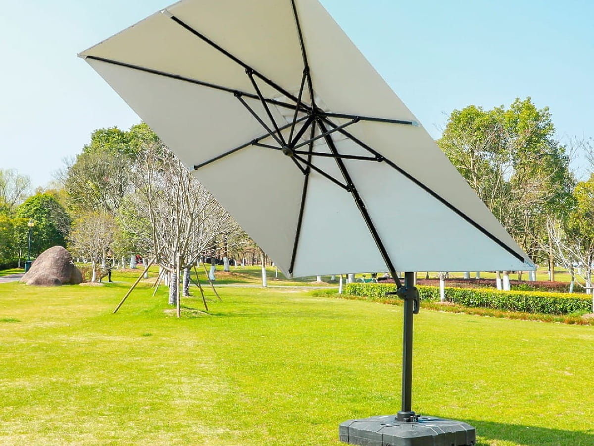 Large square parasol with adjustable angle and durable polyester cover. .. more