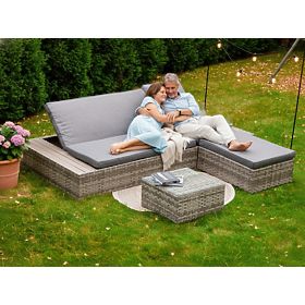 The DIABOLICO garden furniture set embodies modernity and functionality, offering a perfect combination of high-quality aluminum and technorattan. This unique material blend not only ensures the furniture's exceptional resistance to rain, frost, and extreme temperatures but also adds an extraordinary style. The garden furniture, consisting of a pouf, table, and bed that can also serve as a sofa, is an ideal solution for anyone who values both aesthetics and practicality. Adjustable backrests allow for a quick and easy transformation from sofa to bed, enhancing the set's versatility. The DIABOLICO relaxation furniture set, with its wide weaving in shades of gray and elegantly finished cushions, is not just furniture but a piece of art that adds class and unique character to any outdoor space. DIABOLICO set color: gray mélange, uneven Weaving: technorattan 15mm x 1.2mm, smooth structure Furniture construction: aluminum Set composed of 3 elements: 1 x bed/sofa: length: 227 cm width: 114 cm height: 30 cm bed for 2 people: 3-level backrest adjustment sofa for 3 people: 4-level backrest adjustment Maximum height with 3 raised sofa backrests (from the seat): 42 cm 1 x pouf: length: 78 cm width: 58 cm height: 30 cm 1 x table (with a glass, transparent top made of 5mm safety glass): length: 54 cm width: 54 cm height: 30 cm Seat height of the sofa/bed and pouf: 30 cm + 8 cm cushion The bed is shipped in 1 carton with dimensions 230x32x117 cm, weight 35 kg Cushions in gray color included in the set. All have removable covers with zippers, made from outdoor material (100% polyester), washable at low temperatures. The cushion covers are sewn from high-quality fabric coated with Teflon, protecting them from moisture. Cushion filling is made from high-quality upholstery foam (medium-hard - T25), preventing deformation. Cushion thickness: 8 cm Technorattan is resistant to harmful weather conditions, but to enjoy the unchanged appearance of the furniture for even longer, we recommend purchasing a protective cover. The dark gray cover is one-piece and has a drawstring at the bottom, threaded through metal eyelets. All covers are custom-made, with a lead time of approximately 21 working days. Imagine garden furniture that exceeds your expectations in every way – from durability to design. This is BELLO GIARDINO, where every detail matters and luxury meets functionality: Indestructible quality: Our synthetic rattan guarantees that the furniture will last for years without losing its beauty or durability. Weather resistance: Our furniture withstands the toughest weather conditions, from scorching sun to freezing winters, remaining beautiful. Luxurious comfort: Thick, soft cushions invite relaxation, offering comfort hard to find elsewhere. Lightness and strength: The aluminum construction combines the best of both worlds – it is lightweight yet exceptionally stable. Design that enchants: Every element of our furniture is designed with aesthetics and functionality in mind, fitting into any environment. Whether you are a minimalist lover or appreciate rich, elegant arrangements, our furniture meets your expectations, surpassing the boundaries of ordinary functionality and aesthetics. We ensure that even the most demanding customers cannot resist the comfort and style offered by BELLO GIARDINO. Turn your garden, terrace, or balcony into an oasis of relaxation and elegance you've always wanted. Don't wait, discover BELLO GIARDINO today and transform your outdoor spaces into places you've always dreamed of. Customer photos