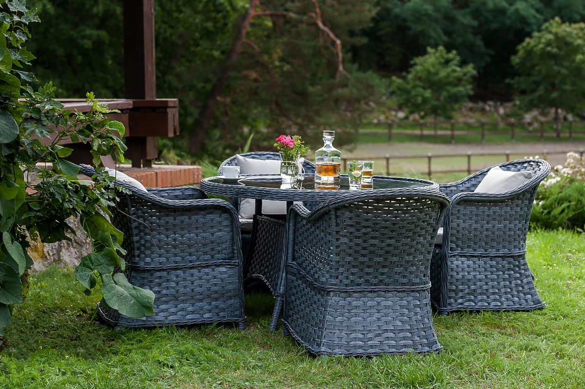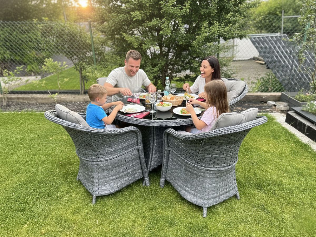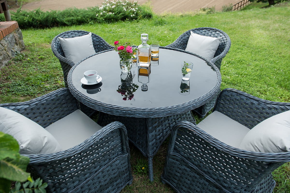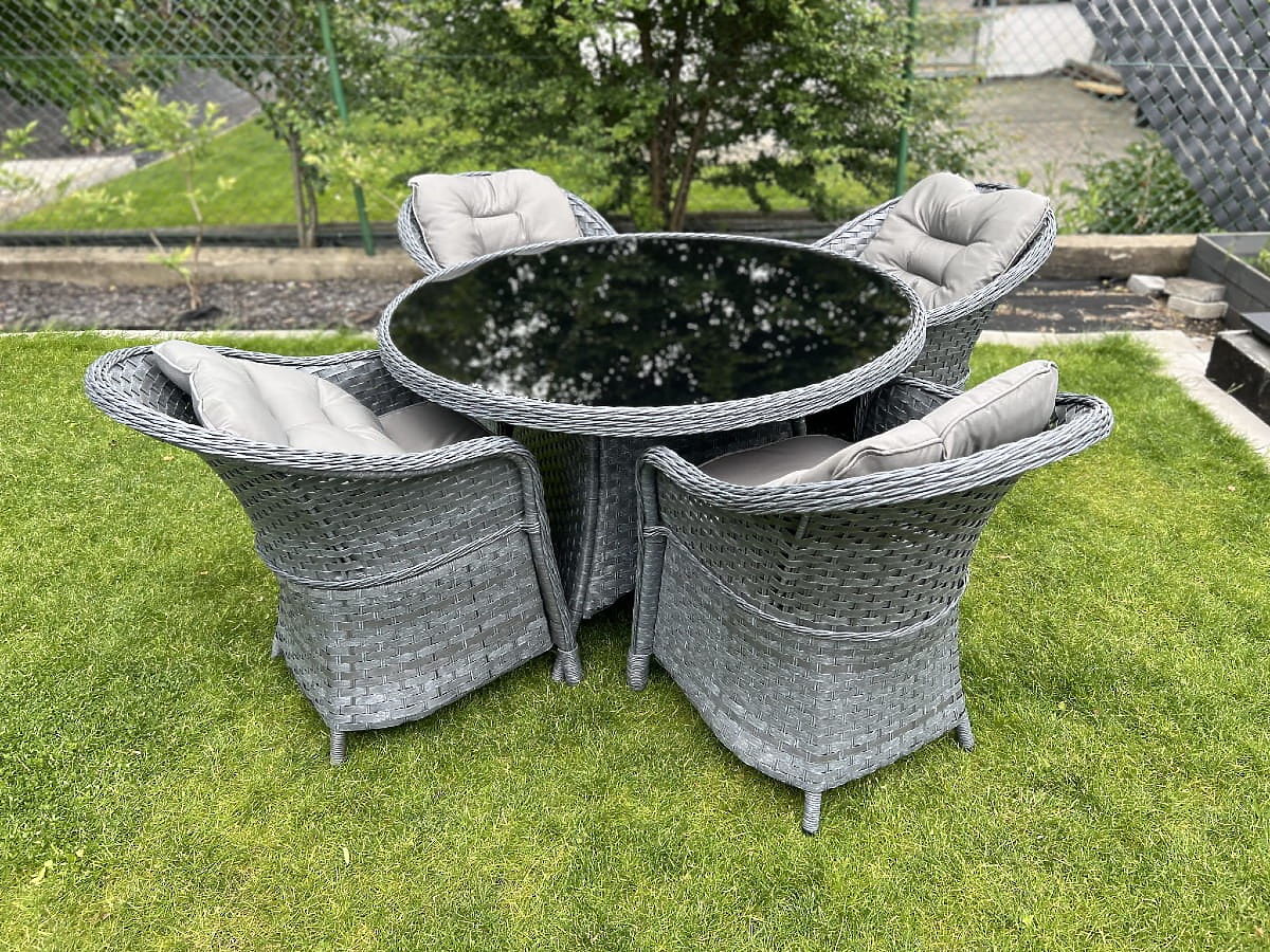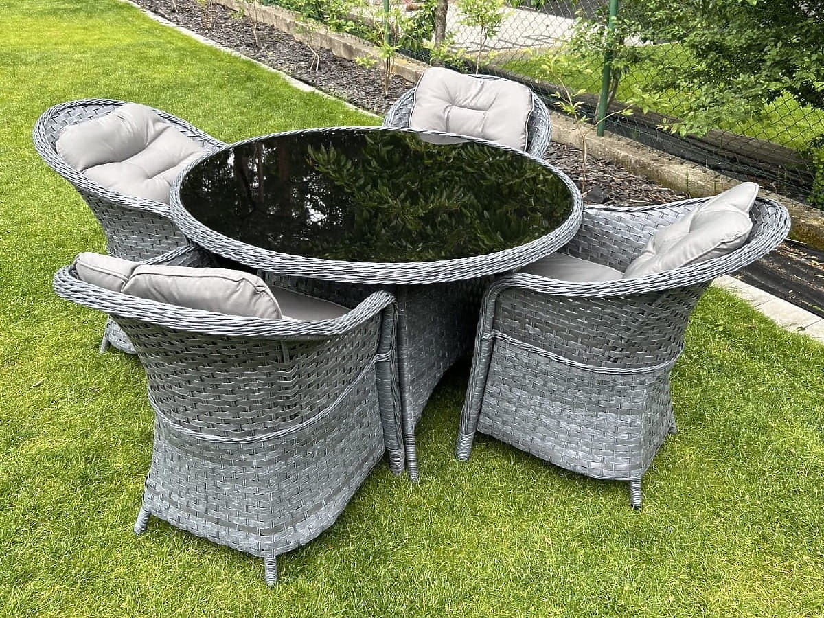 The MODERNO dining set is the quintessence of modern design and an innovative approach to interior furnishings. It features a unique design that stands out from standard solutions, offering not only aesthetics but also unparalleled durability thanks to the use of high-quality synthetic rattan. Its absolute weather resistance makes this set an ideal choice for both indoor and outdoor spaces. By choosing the MODERNO set, you are investing in furniture that not only looks beautiful but is also designed for long-term use, meeting the expectations of the most demanding customers seeking a unique combination of functionality, durability, and contemporary style. Set color: gray melange, uneven Cushion color: dark gray Weaving: flat technorattan 17 mm x 1.2 mm and round technorattan, smooth texture Construction: steel Set composed of 5 elements: 4 x chair: width: 56 cm depth: 70 cm height: 81 cm 1 x table (with black glass top made of 5mm safety glass): diameter: 120 cm height: 74 cm Additional dimensions: Seat height of the chair: 38 cm + 5 cm cushion Backrest height from the seat: 50 cm Armrest and backrest width: 5 cm Seat width and depth: 52 x 52 cm The set is shipped on 1 pallet with dimensions 120x100x210 cm, weight 70 kg Cushions in dark gray for the seats included in the set (4 pcs) All have removable covers with zippers, made from outdoor material (100% polyester), washable at low temperatures. The cushion covers are made from high-quality fabric coated with Teflon, protecting them from moisture. The cushion filling is made from high-quality upholstery foam (medium-hard - T25), preventing deformations. Cushion thickness: 5 cm. Possibility of custom-made cushions for this set: https://www.bg-meble.pl/pl/p/Usluga-Krawiecka-Poduszki-Na-Zamowienie-/742 Possibility of custom-made cushion covers for this set: https://www.bg-meble.pl/pl/p/Usluga-Krawiecka-Poszewki-Na-Zamowienie/743 For longer preservation of the furniture's appearance, we recommend purchasing a protective cover. The cover in dark gray is one-piece and has a drawstring at the bottom. All covers are custom-made and the delivery time is approximately 14 working days. Imagine garden furniture that exceeds your expectations in every way – from durability to design. This is BELLO GIARDINO, where every detail matters and luxury meets functionality: Timeless quality: Our synthetic rattan guarantees that the furniture will last for years without losing its beauty or durability. Weather resistance: Our furniture withstands the harshest weather conditions, from scorching sun to freezing winters, remaining beautiful. Luxurious comfort: Thick, soft cushions invite relaxation, offering comfort hard to find elsewhere. Lightness and strength: The aluminum construction combines the best of both worlds – it is lightweight yet extremely stable. Design that enchants: Every element of our furniture is designed with aesthetics and functionality in mind, fitting into any environment. Whether you are a fan of minimalism or appreciate rich, elegant arrangements, our furniture will meet your expectations, surpassing the boundaries of ordinary functionality and aesthetics. We guarantee that even the most resilient customers will not be able to resist the comfort and style offered by BELLO GIARDINO. Turn your garden, terrace, or balcony into an oasis of relaxation and elegance that you've always wanted. Don't wait, discover BELLO GIARDINO today and transform your outdoor spaces into places you've always dreamed of. Photos from our customers