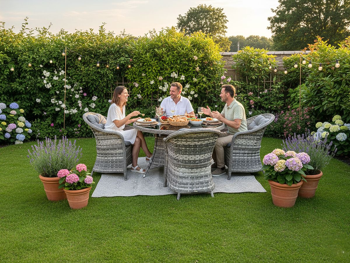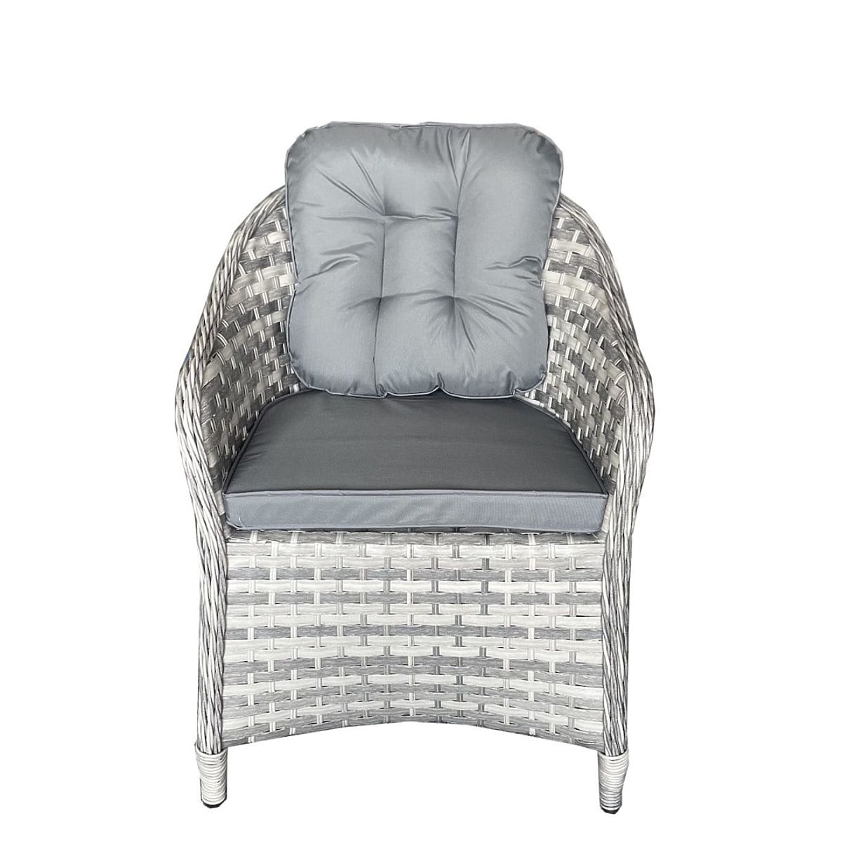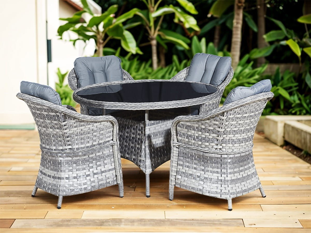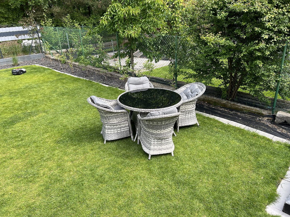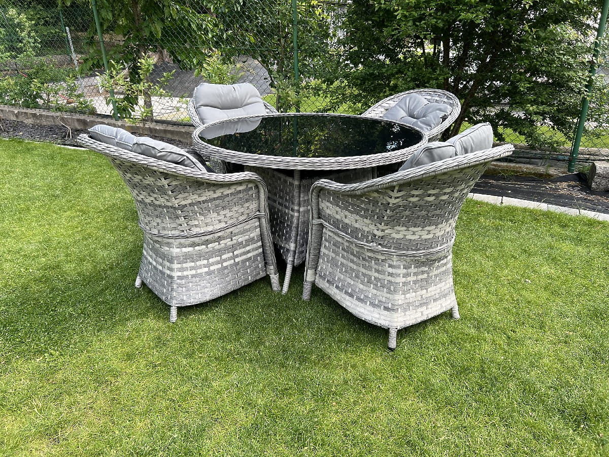 The MODERNO dining furniture set is synonymous with modernity and elegance in space arrangement. It features an unusual design that fits the latest design trends while offering exceptional durability and resistance thanks to the use of the highest quality synthetic rattan. The chairs and table from this collection are completely resistant to harmful weather conditions, making the MODERNO set a great choice for both indoor and outdoor use. This exceptional furniture set was designed with the most demanding customers in mind, who are looking for a combination of functionality, durability, and modern design. Set color: light gray melange, non-uniform Cushion color: dark gray Weave: flat technorattan 17mm x 1.2mm and round technorattan, smooth structure Frame: steel The set consists of 5 elements: 4 x chair: width: 56 cm depth: 70 cm height: 81 cm 1 x table (with black glass top made of 5mm safety glass): diameter: 120 cm height: 74 cm Additional dimensions: Chair seat height: 38 cm + 5 cm cushion Backrest height from seat: 50 cm Armrest and backrest width: 5 cm Seat width and depth: 52 x 52 cm The set is shipped on 1 pallet with dimensions 120x100x210 cm, weight 70 kg Dark gray cushions for seats included in the set (4 pcs) All have removable covers with zippers, made of outdoor material (100% polyester), which can be washed at low temperatures. The cushion covers are made of high-quality fabric coated with Teflon, which protects them from moisture. The cushion filling is made of high-quality upholstery foam (medium hard - T25), which prevents deformation. Cushion thickness: 5 cm. Custom cushion sewing service for this set available: https://www.bg-meble.pl/pl/p/Usluga-Krawiecka-Poduszki-Na-Zamowienie-/742 Custom cushion cover sewing service for this set available: https://www.bg-meble.pl/pl/p/Usluga-Krawiecka-Poszewki-Na-Zamowienie/743 To maintain the furniture's appearance for as long as possible, we recommend purchasing a protective cover. The cover in dark gray is one-piece and has a drawstring at the bottom. All covers are custom-made and the delivery time is approximately 14 working days. Imagine garden furniture that exceeds your expectations in every way – from durability to design. This is BELLO GIARDINO, where every detail matters and luxury meets functionality: Timeless quality: Our synthetic rattan ensures that the furniture will last for years without losing its beauty or durability. Weather resistance: Our furniture withstands the harshest weather conditions, from scorching sun to freezing winters, remaining beautiful. Luxurious comfort: Thick, soft cushions invite relaxation, offering comfort that is hard to find elsewhere. Lightness and strength: The aluminum frame combines the best of both worlds – it is lightweight yet exceptionally stable. Design that enchants: Every element of our furniture is designed with aesthetics and functionality in mind, to fit any environment. Whether you are a lover of minimalism or appreciate rich, elegant arrangements, our furniture will meet your expectations, surpassing the boundaries of ordinary functionality and aesthetics. We guarantee that even the most resilient customers will not resist the comfort and style offered by BELLO GIARDINO. Turn your garden, terrace, or balcony into an oasis of relaxation and elegance that you have always wanted. Don't wait, discover BELLO GIARDINO today and transform your outdoor spaces into the places you've always dreamed of. Photos from our customers