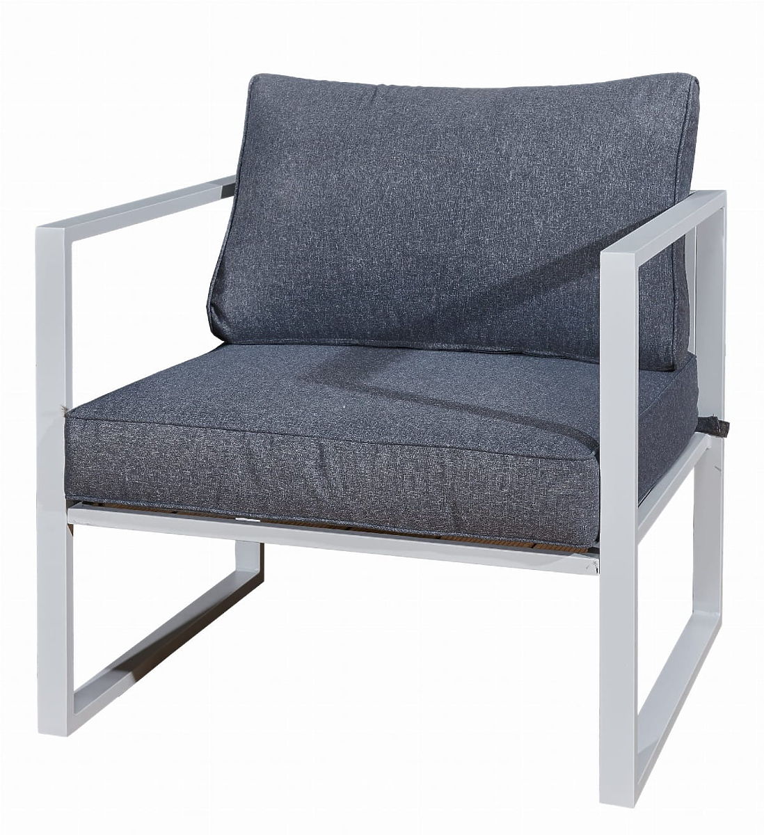 The MOSTRARE garden chair is a perfect blend of modern minimalism with subtle elegance, meeting the expectations of even the most demanding users. This relaxing chair, made from exceptionally durable aluminum and additionally protected with powder coating, is characterized not only by its high resistance to the harmful effects of sunlight, extreme temperatures, or humidity, but also by being a striking decorative element in any outdoor or indoor space. The wide seat combined with a comfortable, thick cushion invites daily use and offers unparalleled comfort for relaxation. Thanks to its durability and universal design, the MOSTRARE balcony chair is an excellent choice for those seeking garden furniture that will serve for years while maintaining its aesthetic and functional qualities. Color of the MOSTRARE chair: white Furniture construction: aluminum (requires simple assembly) 1 x Chair: width: 73 cm depth: 67 cm height: 63 cm seat depth: 65 cm seat width: 65 cm Additional dimensions: Width of armrests and backrest: 4 cm Seat height of the chair: 30 cm + 10 cm cushion Backrest height from the seat: 34 cm The chair is shipped in 1 carton with dimensions 75x75x45 cm, weight 10 kg Gray cushions are included in the set (1 piece for the seat, 1 piece for the backrest). All have removable covers with zippers, made from outdoor material (100% polyester), which can be washed at low temperatures. The cushion covers are made from high-quality fabric coated with Teflon, which protects them from moisture. The cushion filling is made from high-quality upholstery foam (medium hard - T25), which prevents deformation. Cushion thickness for the seat: 10 cm. Option to have cushions made to order for this set: https://www.bg-meble.pl/pl/p/Usluga-Krawiecka-Poduszki-Na-Zamowienie-/742 Option to have cushion covers made to order for this set: https://www.bg-meble.pl/pl/p/Usluga-Krawiecka-Poszewki-Na-Zamowienie/743 To enjoy the unchanged appearance of the furniture even longer, we recommend purchasing a protective cover. The cover in dark gray is one-piece and has a drawstring at the bottom, threaded through metal eyelets. All covers are custom-made and the delivery time is approximately 21 working days. Imagine garden furniture that exceeds your expectations in every way – from durability to design. This is BELLO GIARDINO, where every detail matters and luxury meets functionality: Timeless quality: Our synthetic rattan guarantees that the furniture will last for years without losing its beauty or durability. Weather resistance: Our furniture withstands the harshest weather conditions, from scorching sun to freezing winters, remaining beautiful. Luxurious comfort: Thick, soft cushions invite relaxation and offer comfort that is hard to find elsewhere. Lightness and durability: The aluminum construction combines the best of both worlds – it is lightweight yet exceptionally stable. Design that enchants: Every element of our furniture is designed with aesthetics and functionality in mind, to fit into any environment. Whether you are a lover of minimalism or appreciate rich, elegant arrangements, our furniture will meet your expectations, surpassing the boundaries of ordinary functionality and aesthetics. We ensure that even the most resilient customers will not resist the comfort and style offered by BELLO GIARDINO. Turn your garden, terrace, or balcony into an oasis of relaxation and elegance you've always wanted. Don't wait, discover BELLO GIARDINO today and transform your outdoor spaces into places you've always dreamed of.