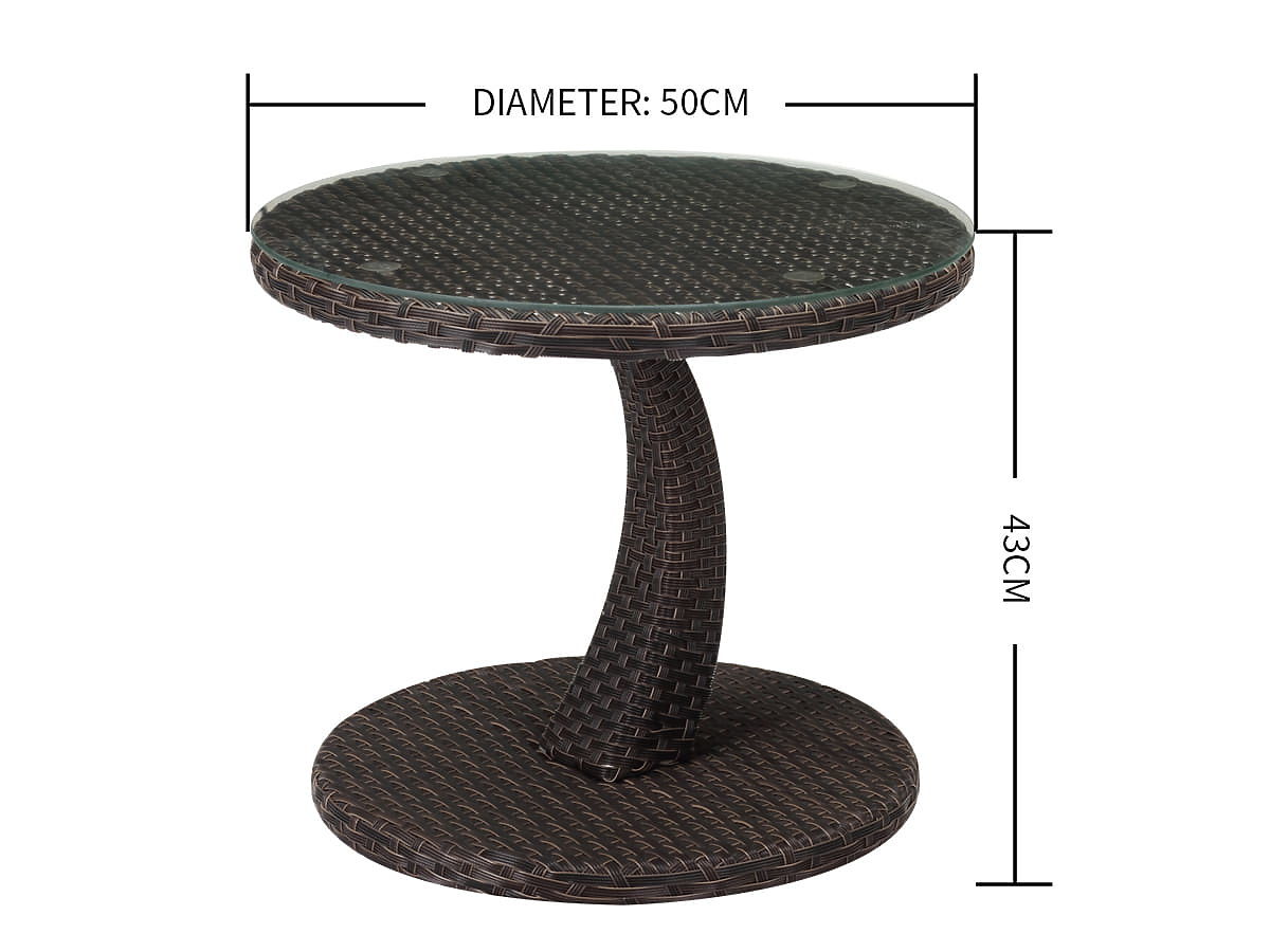 Enhance your relaxation zone with a practical and stylish garden table. This compact furniture piece is the perfect companion for your lounger, chair, or garden sofa. With its universal design, it fits perfectly on a balcony, terrace, or even in a small coffee corner in the garden. The table features a sturdy construction. The use of alu-rattan technology ensures that the furniture is not only durable and stable but also fully resistant to changing weather conditions and easy to clean. Its round top with an optimal diameter of 50 cm provides ample space for a cup of coffee, a book, or a phone, and the height of 43 cm guarantees easy access from the level of most relaxation furniture. Technical specifications: Type of furniture: Coffee table Material: Alu-rattan (aluminum frame with rattan surface) Dimensions: Diameter: 50 cm Height: 43 cm Frame: aluminum with dimensions of 25x11x1.1 mm and 18x18x1.1 mm Surface (Rattan): Weaving with dimensions of 7.5x1.3 mm Type of assembly: KD (construction for self-assembly/disassembly) By choosing our table, you gain not only functional furniture but also an elegant accessory that will highlight the character of your outdoor area. Its durability and timeless appearance make it an investment for many seasons. Enjoy comfort and style in every detail of your garden.