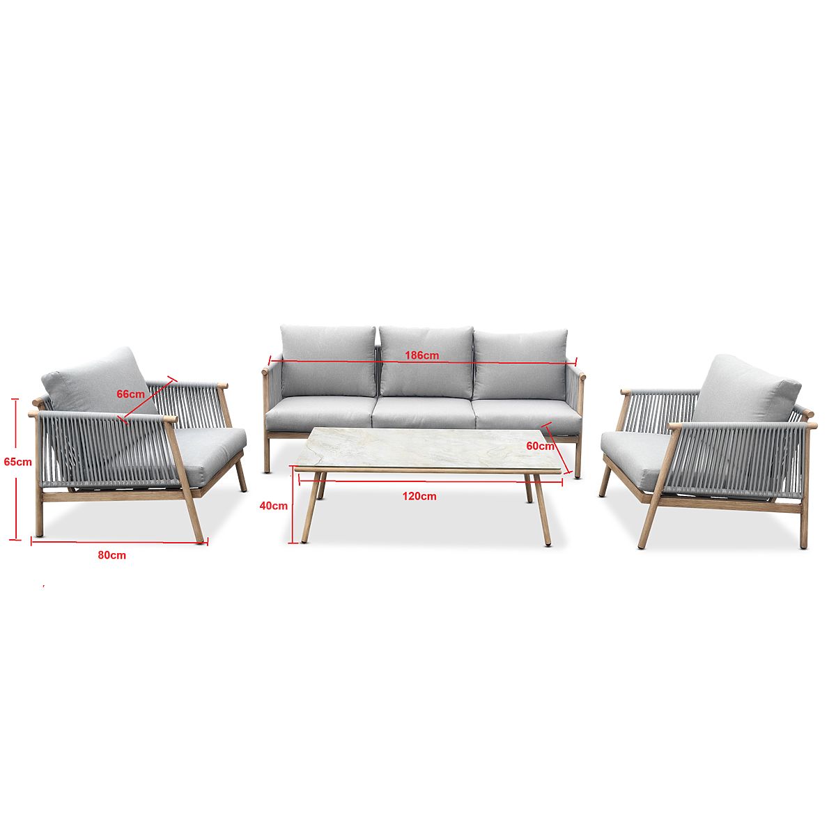 DELIVERY SCHEDULED FOR EARLY APRIL 2026 Transform your outdoor space and create a luxurious relaxation zone with the complete BLANDO furniture set. This 4-piece set epitomizes modern elegance, combining the raw durability of metal with the artistic design of woven synthetic rope. The set, consisting of a spacious sofa, two deep armchairs, and a coffee table, is perfect for a terrace, garden, or large patio, where it becomes the focal point of summer gatherings. The BLANDO furniture construction is based on a sturdy aluminum frame, which is lightweight yet completely resistant to rust and mechanical damage. The unique character of the set is highlighted by the aesthetic weave of flexible rope, which is resistant to changing weather conditions. Exceptional comfort is provided by thick, 10-centimeter cushions and deep seats that allow for complete relaxation. A practical enhancement is the removable covers, which make it easy to maintain cleanliness throughout the season. Technical specifications: Model name: BLANDO Set type: Relaxation set (3-seater sofa + 2 armchairs + coffee table) Material: Aluminum (frame), synthetic rope (weave) Dimensions of the 3-seater sofa: Width: 186 cm Depth: 66 cm Height: 66 cm Dimensions of the armchair (2 pcs): Width: 66 cm Depth: 80 cm Height: 66 cm Dimensions of the coffee table: Length: 120 cm Width: 60 cm Height: 40 cm Seat (sofa and armchairs): Height (without cushion): 26 cm Cushion thickness: 10 cm Additional features: Corrosion and weather resistance, removable cushion covers, lightweight construction, modern design. The BLANDO garden furniture set is an excellent investment in premium quality, combining refined style with durability for years. Its versatile appearance ensures it fits both modern and classic arrangements. Choose the BLANDO set and enjoy top-level comfort in your private relaxation zone.