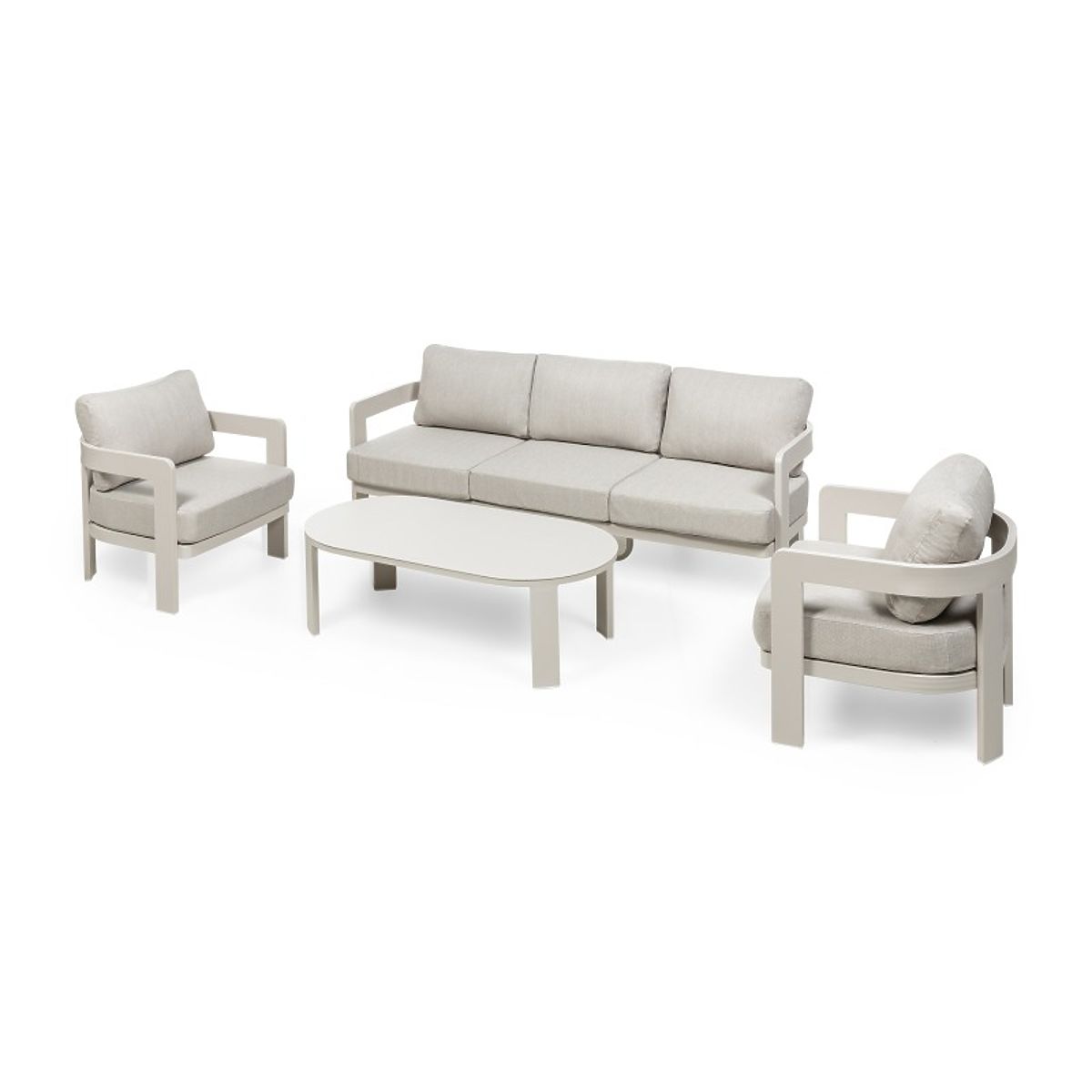 Japori combines tranquility and elegance in one set. The light beige frame and rounded shapes give the space a cozy character, while the soft cushions and oval coffee table invite moments of stylish relaxation.