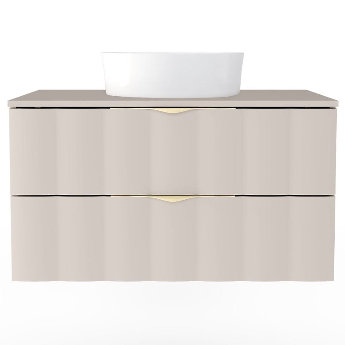 Elevate your bathroom's standard with the cashmere Omi cabinet featuring an elegant design and a wavy front panel. Two spacious drawers with soft-close mechanism and brushed gold handles ensure perfect organization.