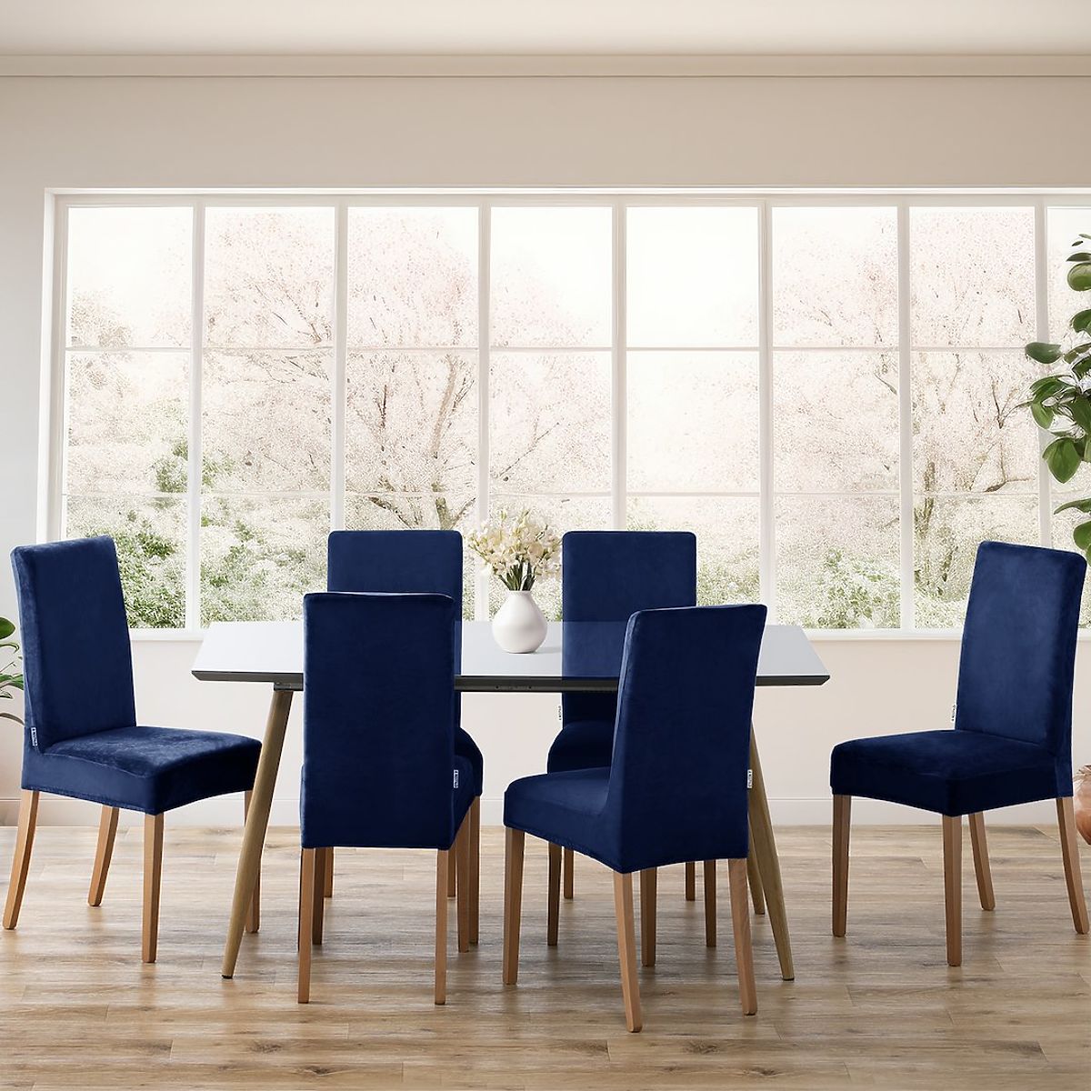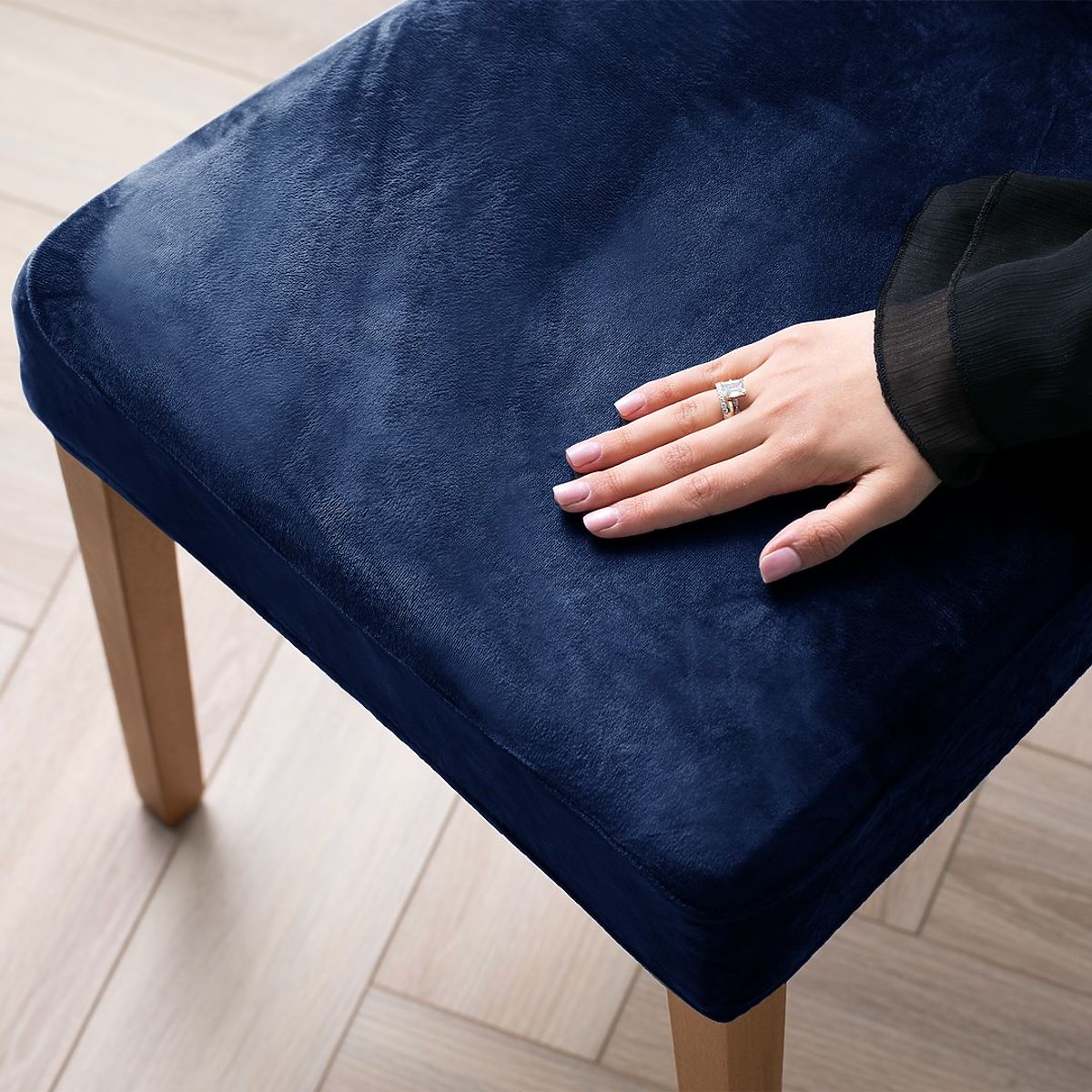 Indigo velour sofa cover with classic style and elastic band. .. more