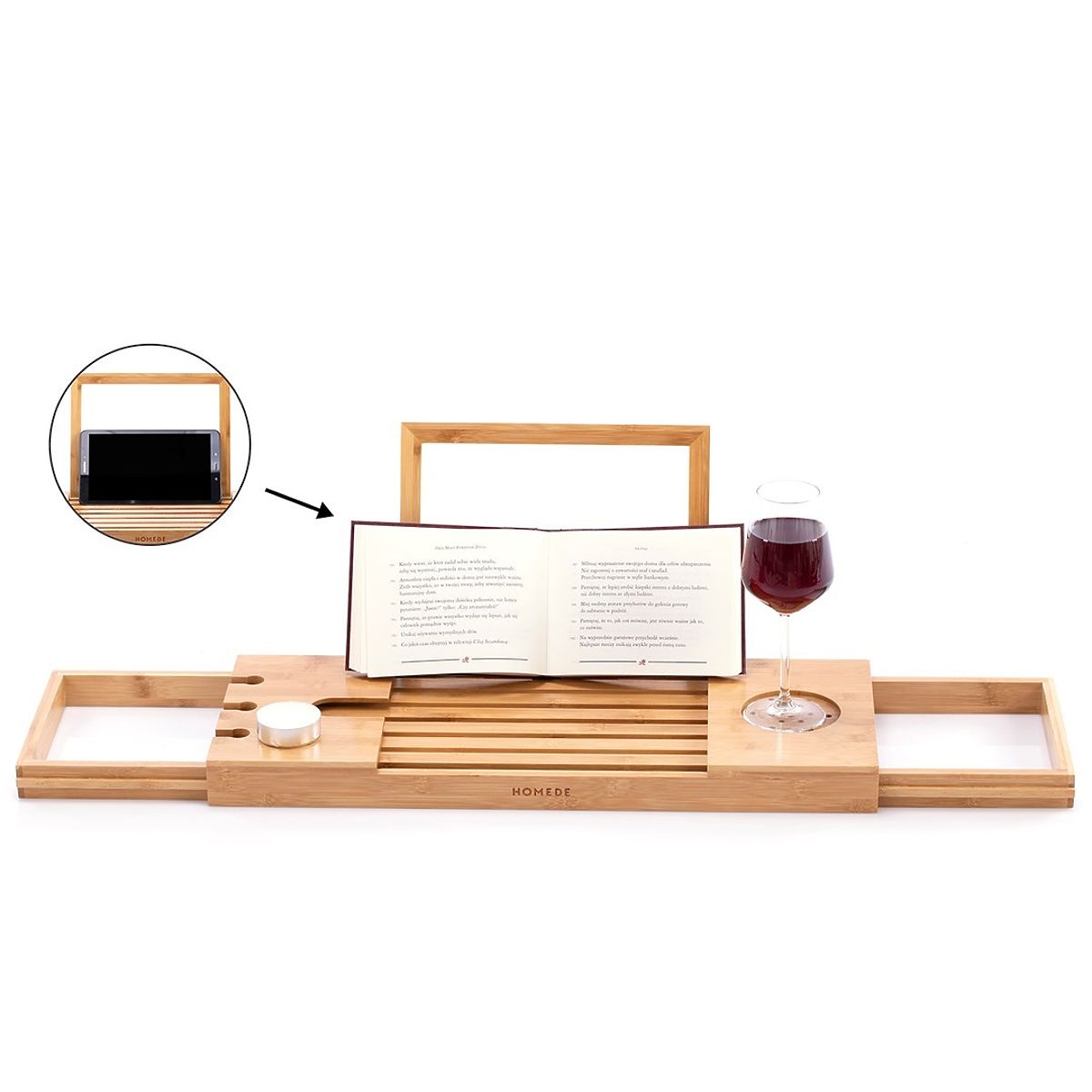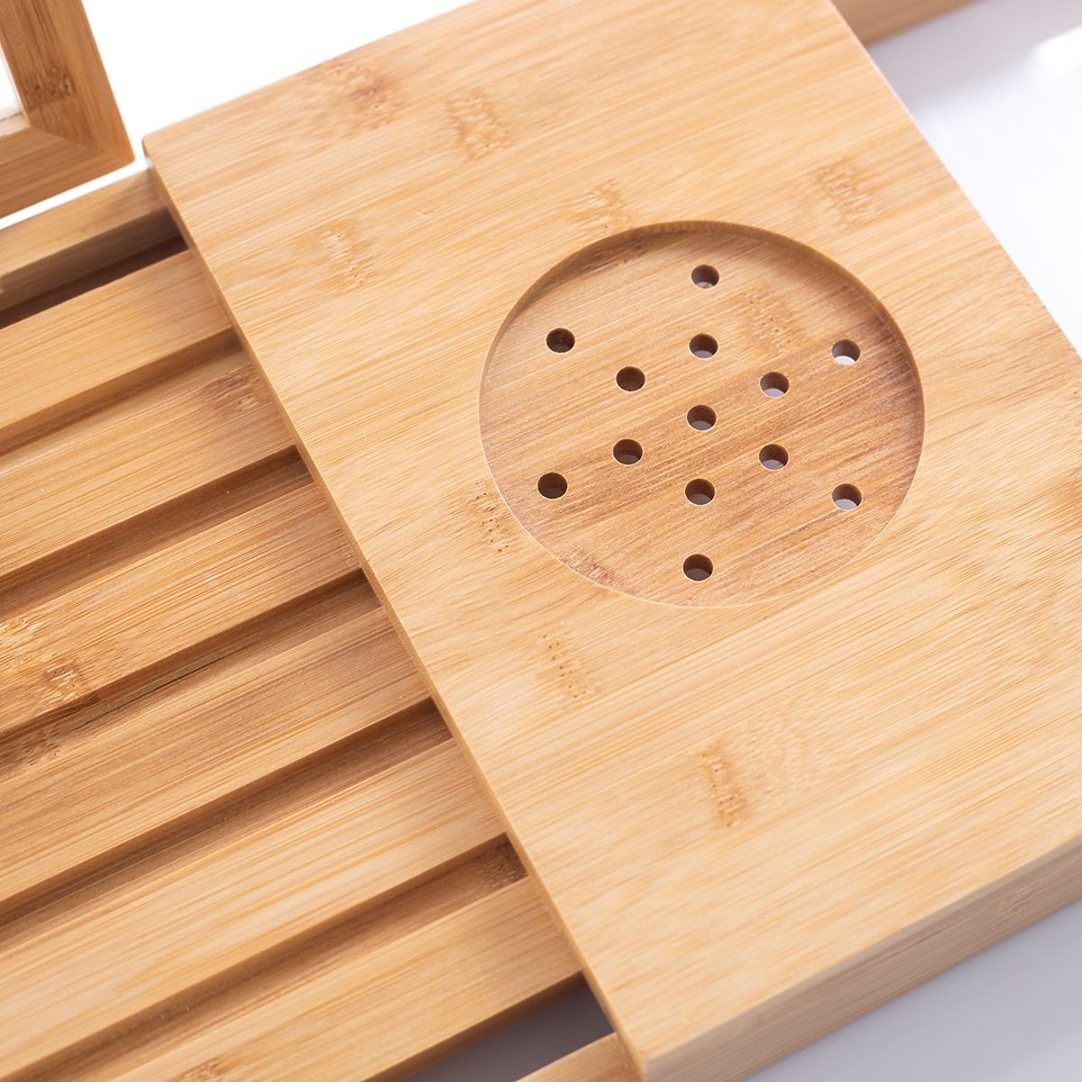 Light brown bamboo wood bathtub tray in boho style for indoor use. .. more
