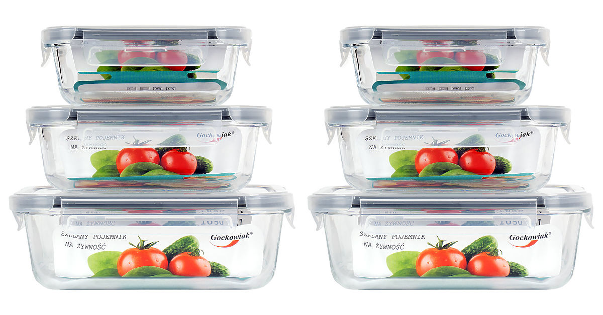 Set of 6 Glass Food Containers AMALFI Model: Amalfi | Number of pieces in set: 6 | Material: Borosilicate Glass ⭐️Set of 6 glass containers ⭐️Durable strong borosilicate glass ⭐️Suitable for fridge, freezer, oven, and microwave ⭐️Silicone seals - guarantee of tightness ⭐️Dishwasher safe ⭐️Purchase from the manufacturer ➡️Where can you use the containers? In the oven (without lid) In the microwave (without lid) In the dishwasher (without lid) In the freezer In the fridge ☑️Specifications: Brand: Gockowiak Model: Amalfi Number of containers in set: 6 pieces Container material: Borosilicate glass Lid material: PP plastic + silicone seal Temperature range (glass): from -40°C to +200°C Temperature range (lids): from -20°C to +120°C Usage: fridge, freezer, microwave, oven Dishwasher safe: yes Lids with steam vents: yes Container color: transparent ☑️Dimensions and volumes of the set: 2 × 370 ml (h x w x d) - (6x15x11 cm) 2 × 640 ml (h x w x d) - (6.5x18x13.5 cm) 2 × 1050 ml (h x w x d) - (7x20.5x15.5 cm) Additional Information The presented colors should be considered indicative - they may differ from the actual ones due to different monitor settings and photo editing processes. Actual dimensions may differ from those listed above. Error tolerance may be +/- 5%. Brand: Gockowiak Product Code: 332856MG EAN Code: 5902340332856 Color: Transparent Material: Borosilicate Glass Number of pieces in set: 6 Dishwasher safe: yes Accessories: steam vents in lids