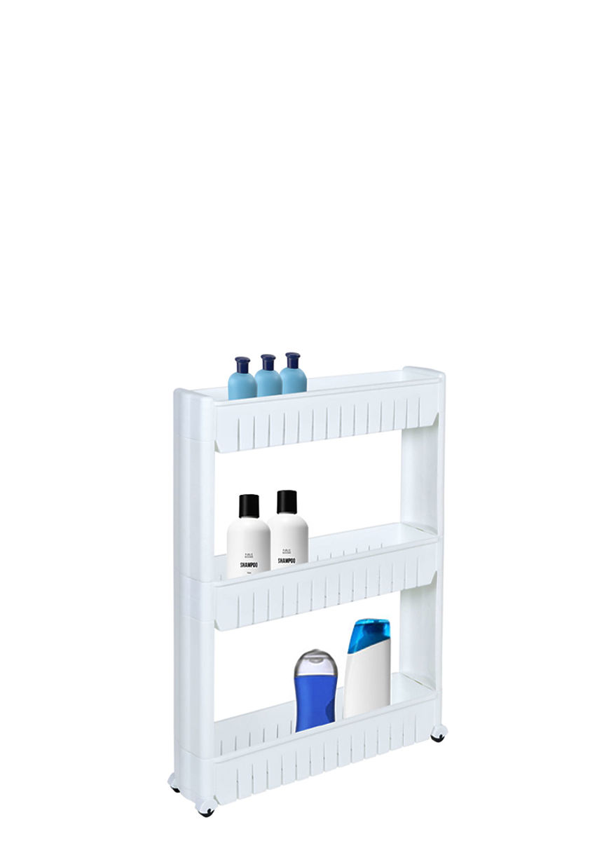 A mobile cabinet ideal for narrow spaces, such as the kitchen or bathroom. Its modular design made of durable plastic allows for easy customization to your needs – shelves can be added or removed. Thanks to its compact dimensions, it fits perfectly between a cabinet and a refrigerator, a washing machine, or other hard-to-reach places. The kitchen rack is perfect for storing spices, kitchen accessories, cosmetics, cleaning supplies, and many other essentials. Mobility is ensured by four wheels, making the bathroom cabinet on wheels easy to move wherever needed.