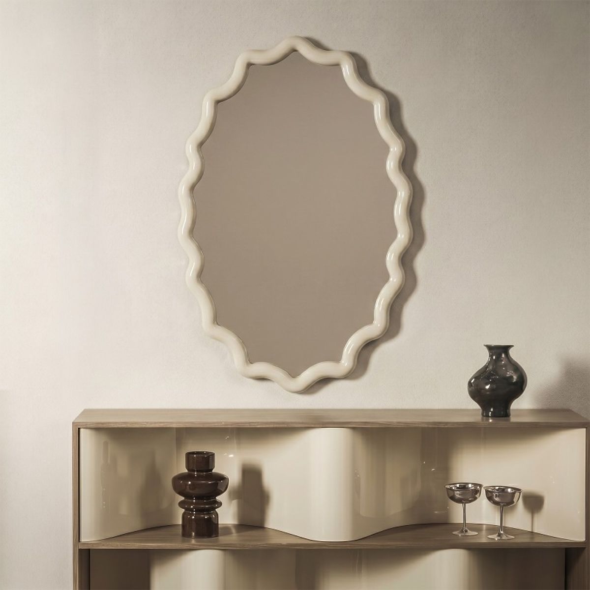 Are you looking for a mirror that will transform your interior? The Lumi mirror is an excellent choice! Its decorative frame in a milky white shade with a high gloss adds elegance and a modern character to the space, perfectly fitting various arrangements.